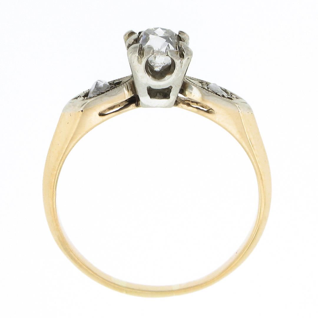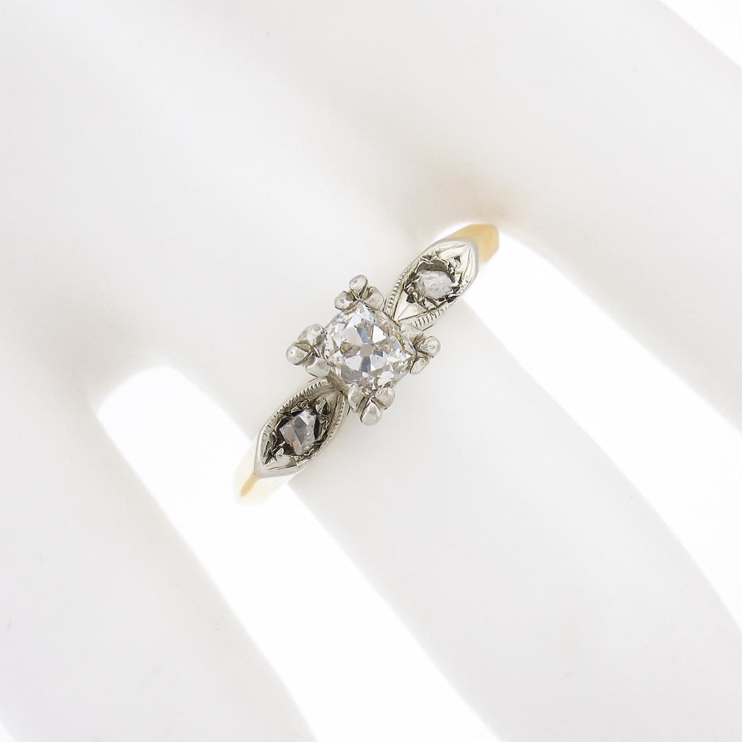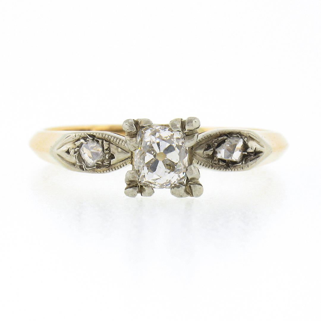 An antique solid 14k yellow & white gold engagement ring, with 1 cushion Peruzzi cut natural diamond (H - SI1 ; 0.45ct), and 2 rose cut natural diamonds (G/H - SI1/SI2 ; 0.08ctw). The ring is size 7.0, weighs a total of 2.28 grams, and measures 5.95mm wide.
