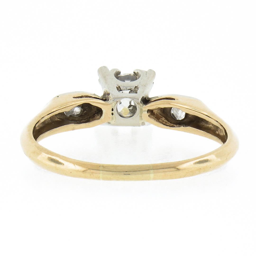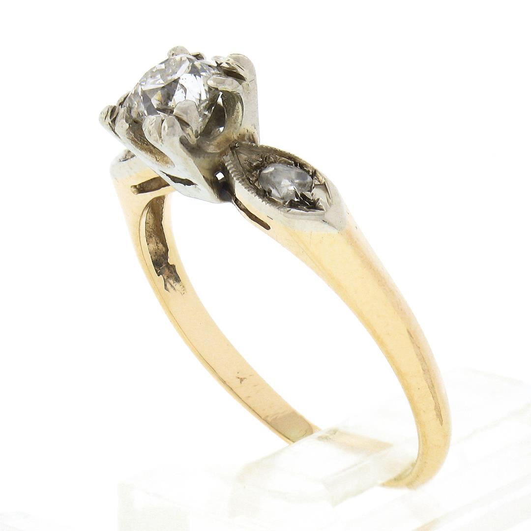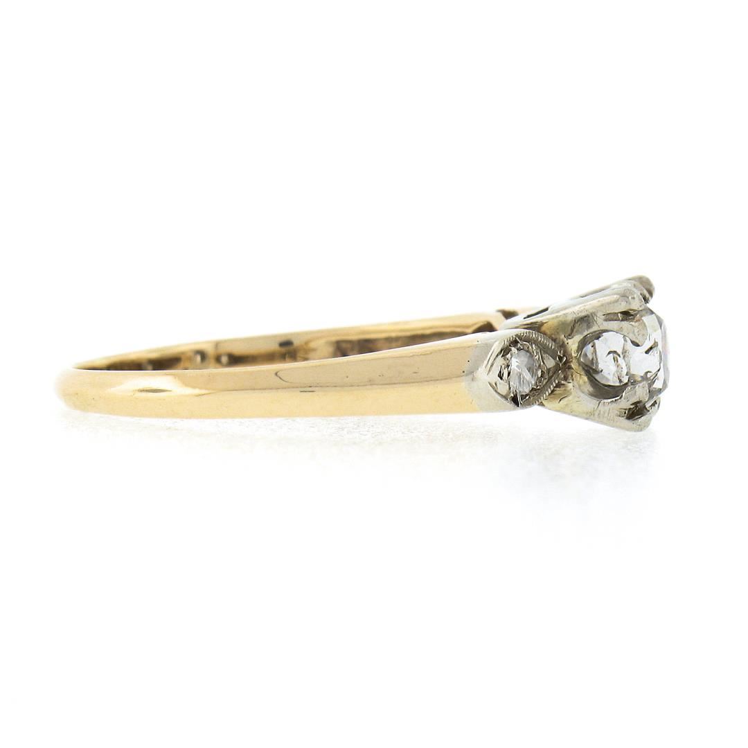 An antique solid 14k yellow & white gold engagement ring, with 1 cushion Peruzzi cut natural diamond (H - SI1 ; 0.45ct), and 2 rose cut natural diamonds (G/H - SI1/SI2 ; 0.08ctw). The ring is size 7.0, weighs a total of 2.28 grams, and measures 5.95mm wide.