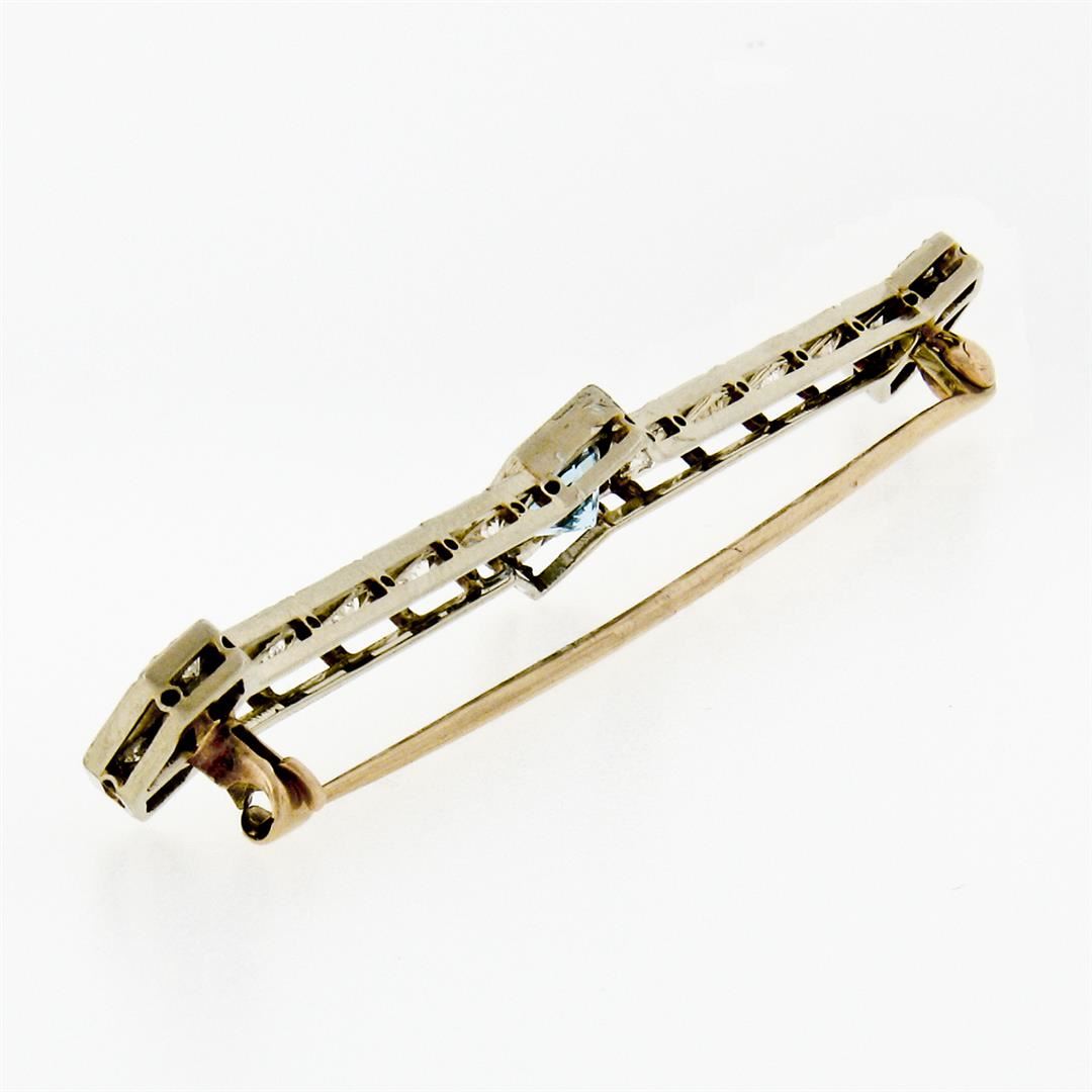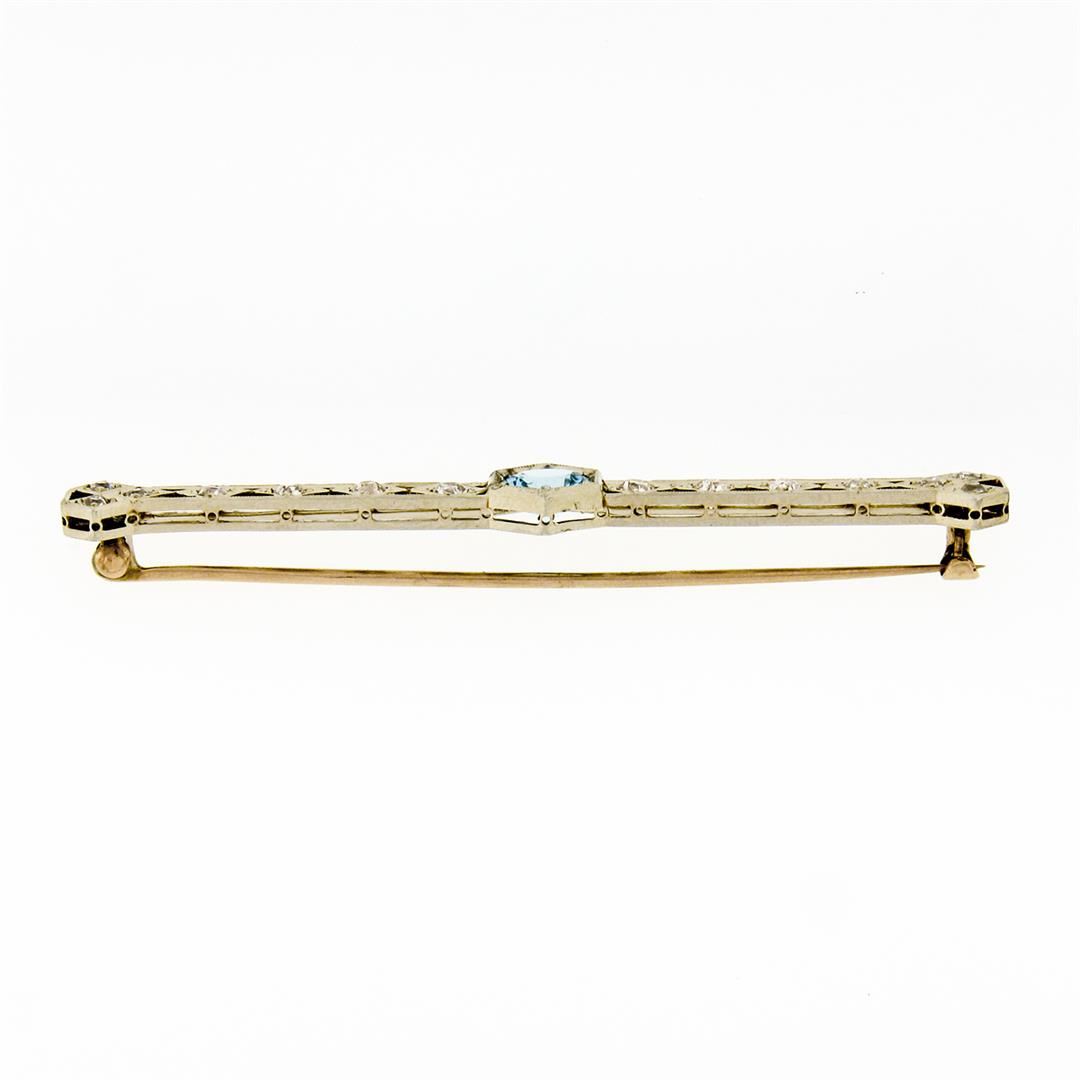 An antique solid white and yellow gold bar pin brooch, with 1 round cut natural aquamarine (1.03ct), and 14 old european cut natural diamonds (I/J - VS1/SI1 ; 1.25ctw). Measures 10.28x73.90mm and weighs a total of 6.37 grams.