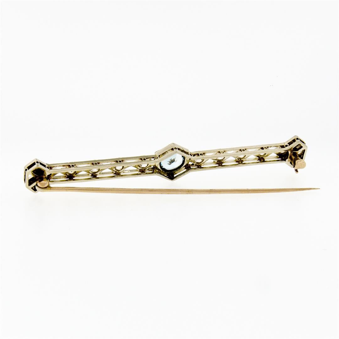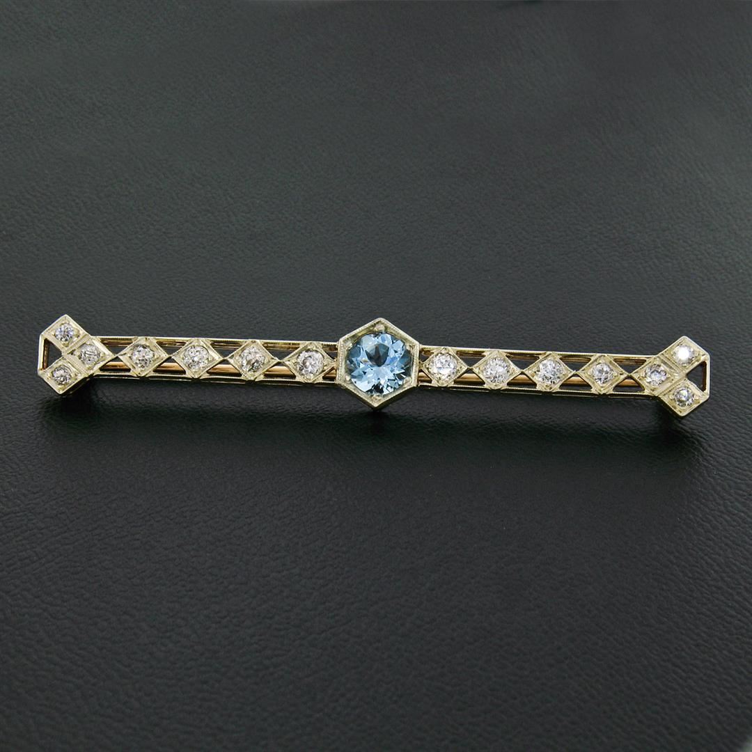 An antique solid white and yellow gold bar pin brooch, with 1 round cut natural aquamarine (1.03ct), and 14 old european cut natural diamonds (I/J - VS1/SI1 ; 1.25ctw). Measures 10.28x73.90mm and weighs a total of 6.37 grams.