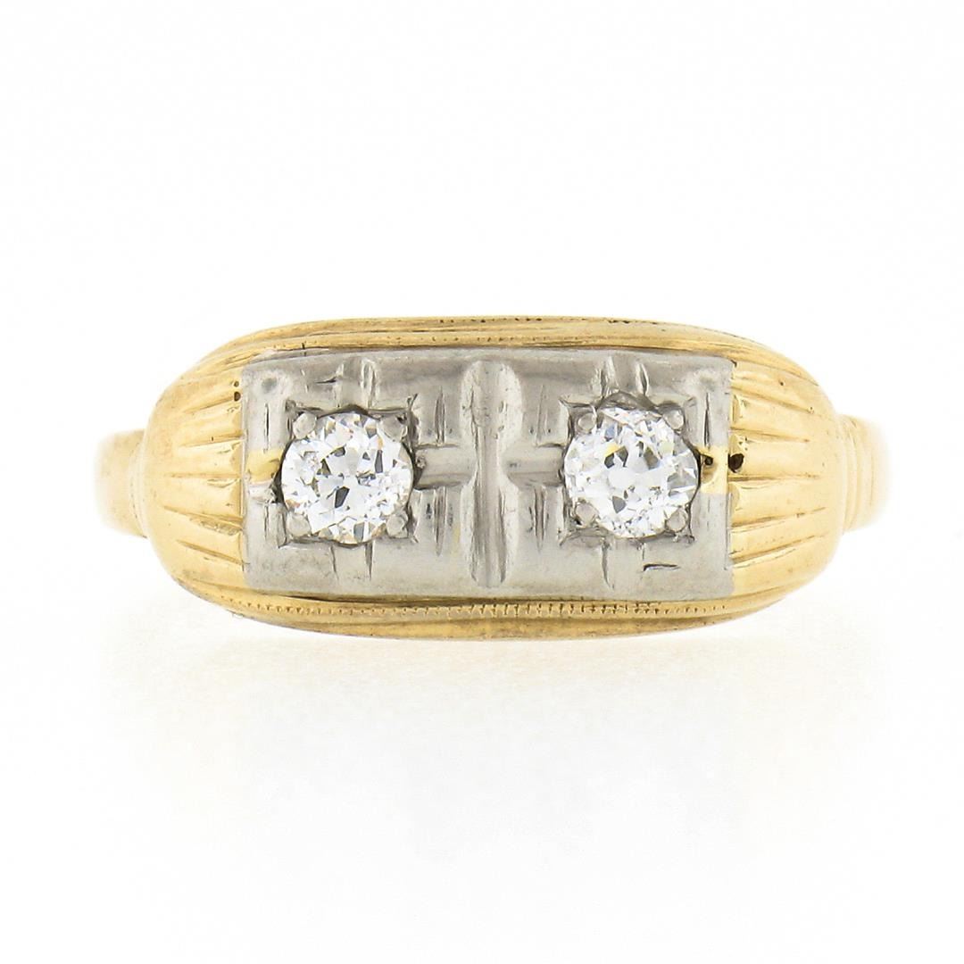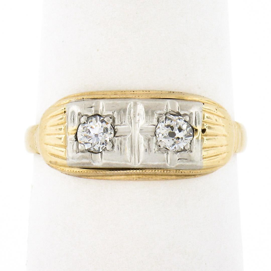An antique solid 14k yellow & white gold band ring, with 2 old European cut natural diamonds (G/H - SI1/SI2 ; 0.20ctw). The ring is size 6.5, weighs a total of 2.57 grams, and measures 7.25mm wide.