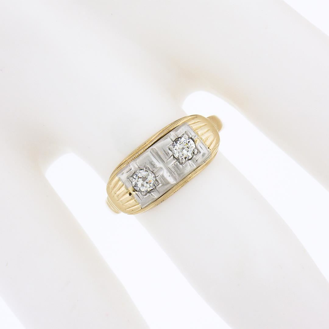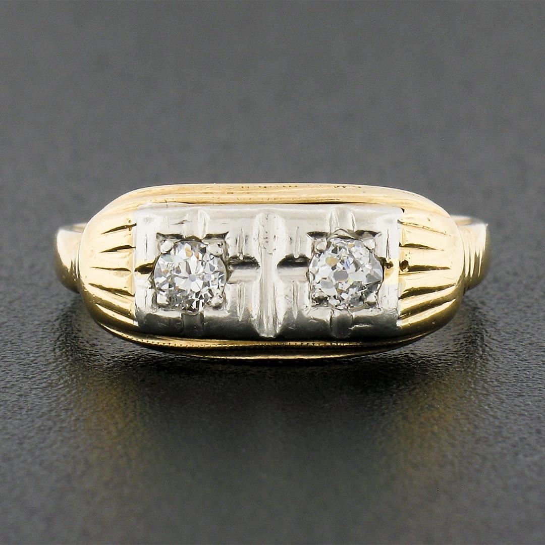 An antique solid 14k yellow & white gold band ring, with 2 old European cut natural diamonds (G/H - SI1/SI2 ; 0.20ctw). The ring is size 6.5, weighs a total of 2.57 grams, and measures 7.25mm wide.