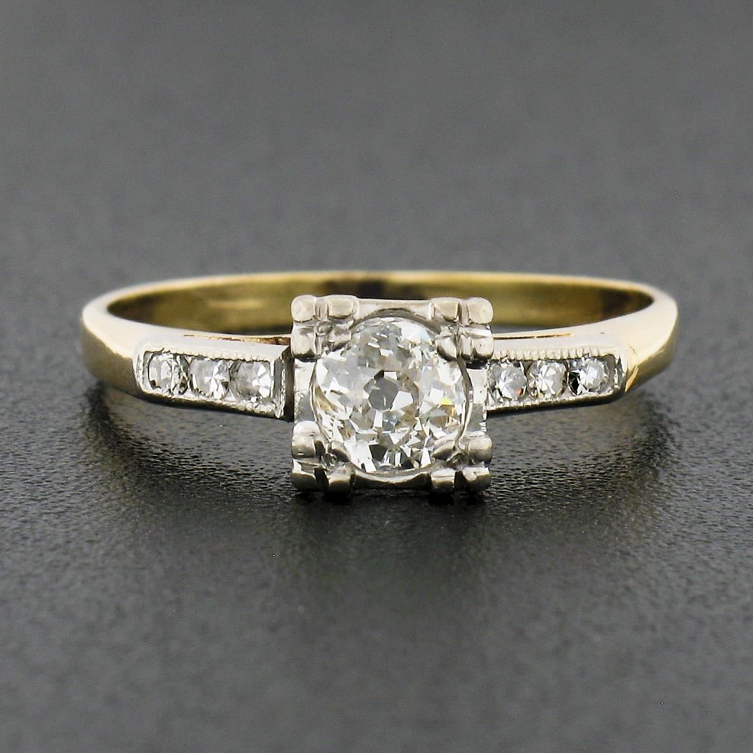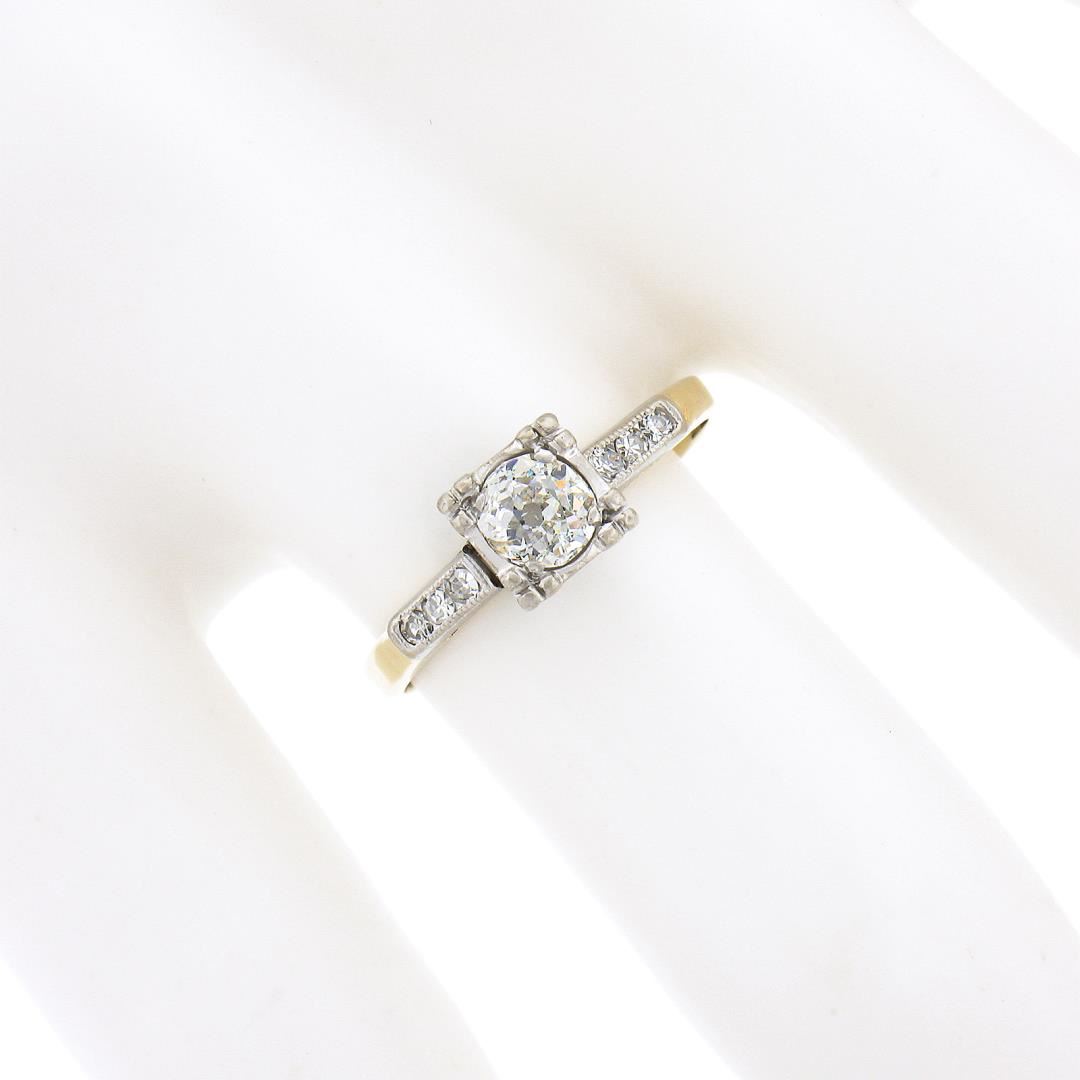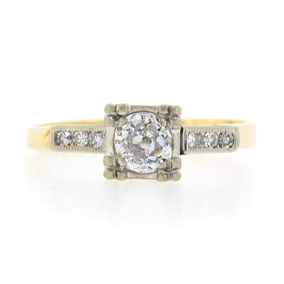 An antique solid 14k yellow and white gold engagement ring, with 1 old European cut natural diamond (I - SI2 ; 0.34ct), accented with 6 old single cut natural diamonds (G/H - VS2/SI1 ; 0.09ctw). The ring is size 5.5, weighs a total of 1.75 grams, and measures 5.5mm wide.