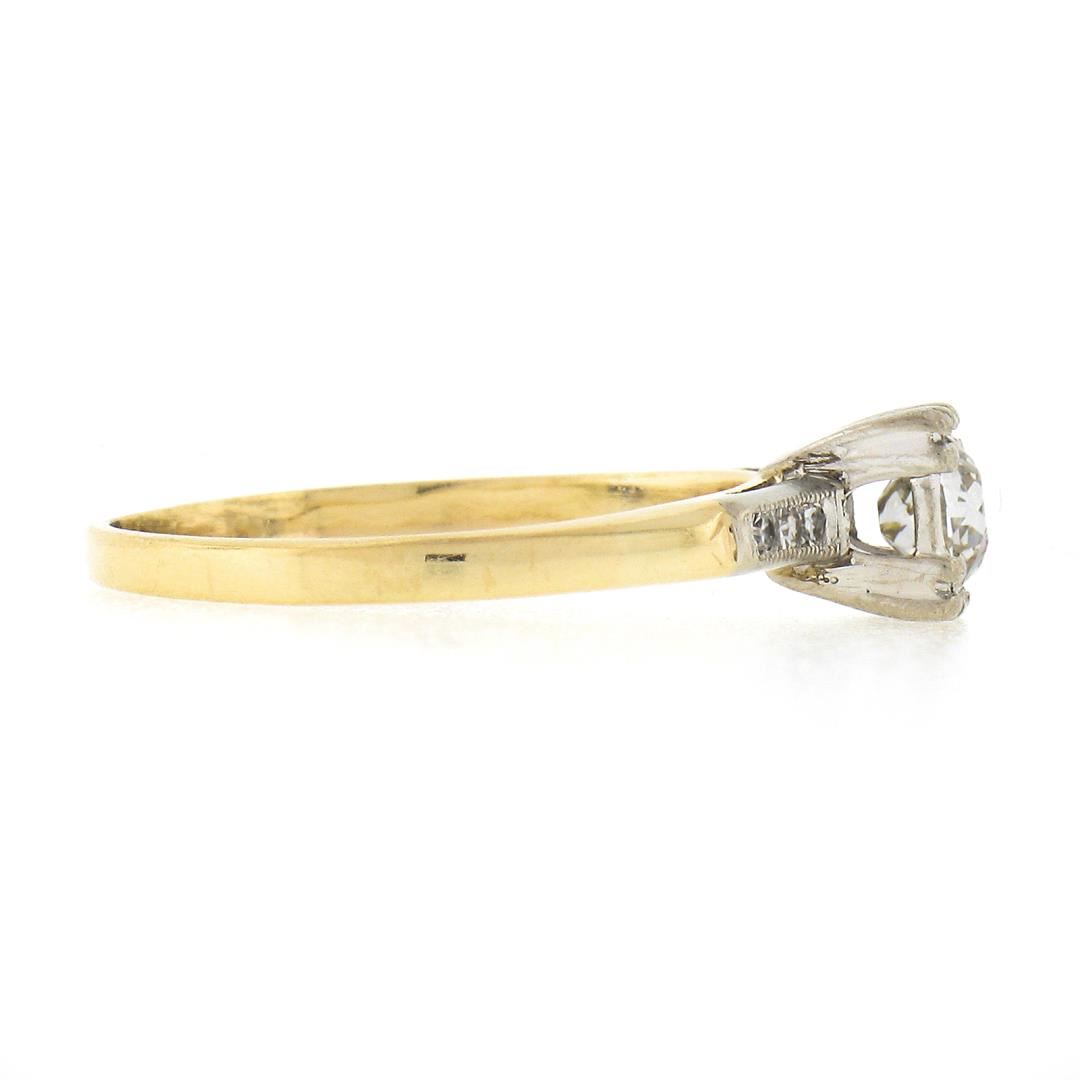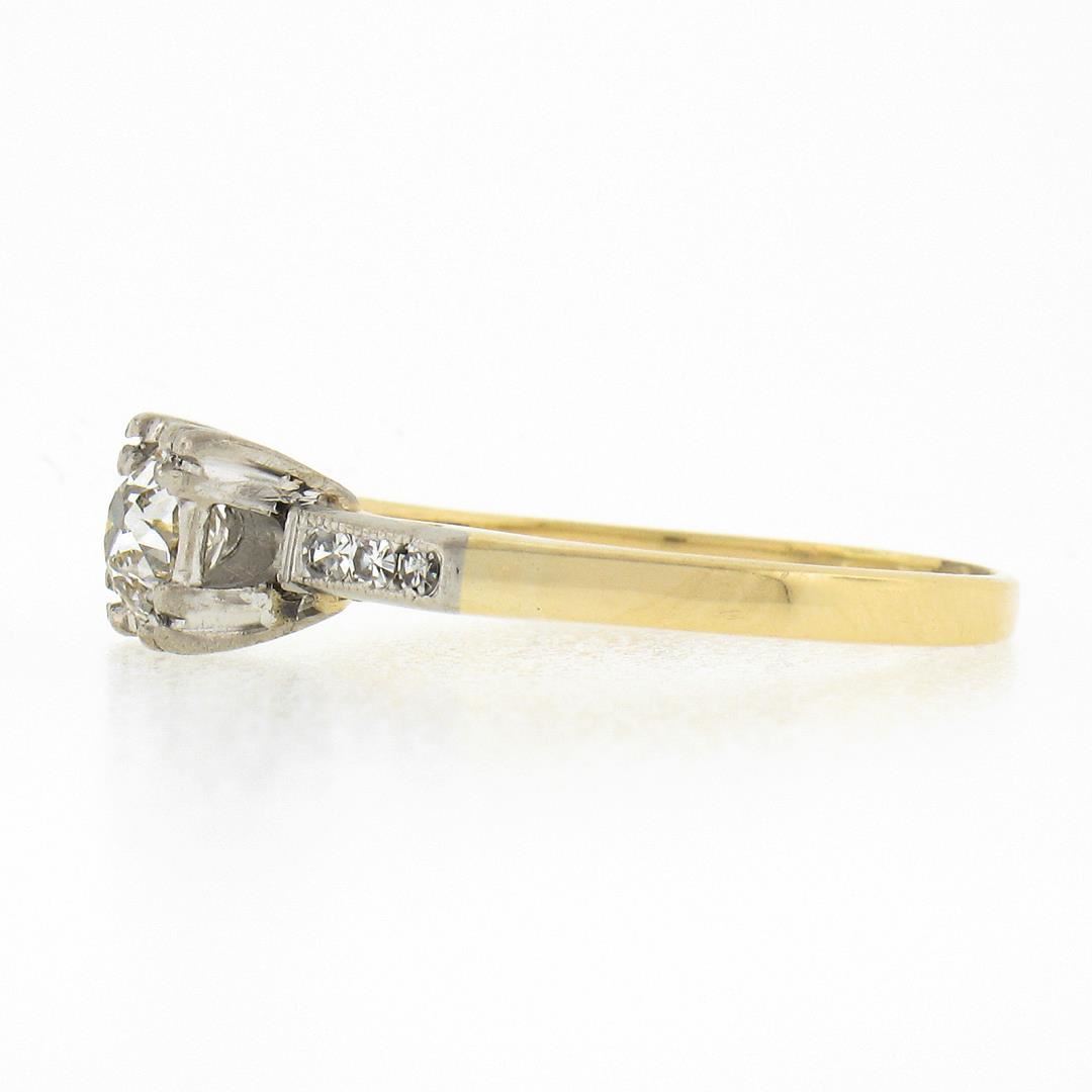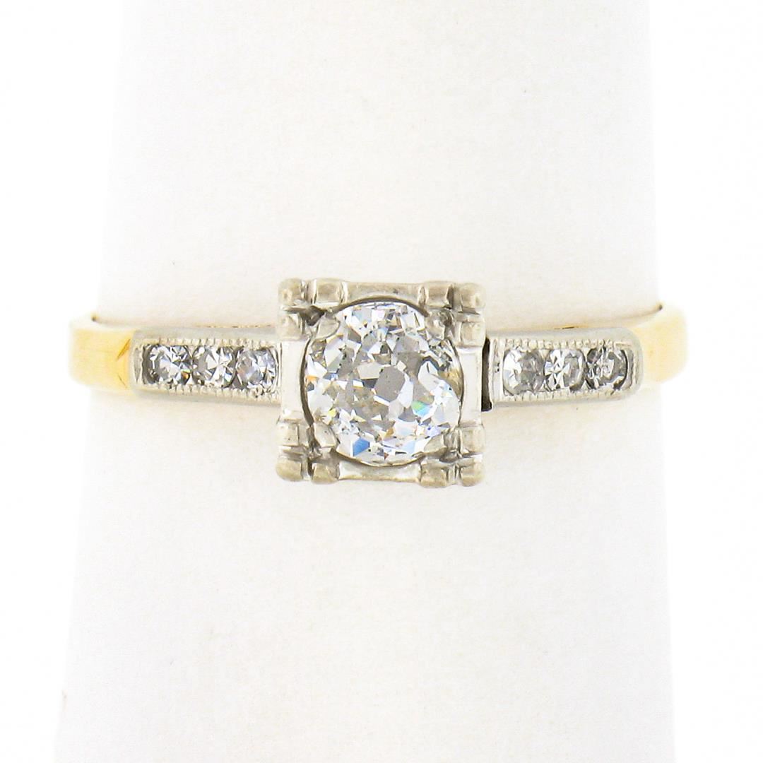 An antique solid 14k yellow and white gold engagement ring, with 1 old European cut natural diamond (I - SI2 ; 0.34ct), accented with 6 old single cut natural diamonds (G/H - VS2/SI1 ; 0.09ctw). The ring is size 5.5, weighs a total of 1.75 grams, and measures 5.5mm wide.