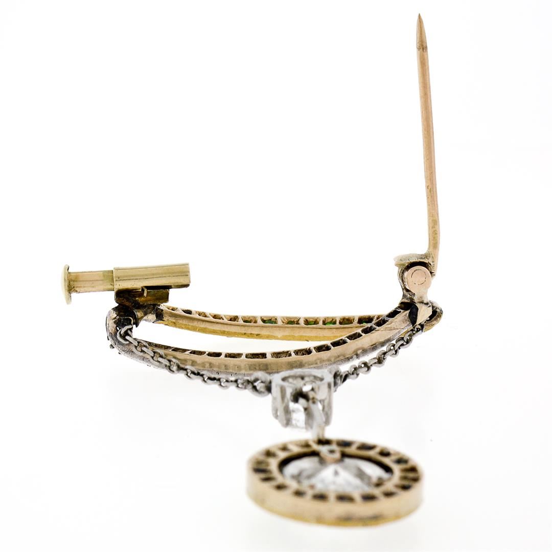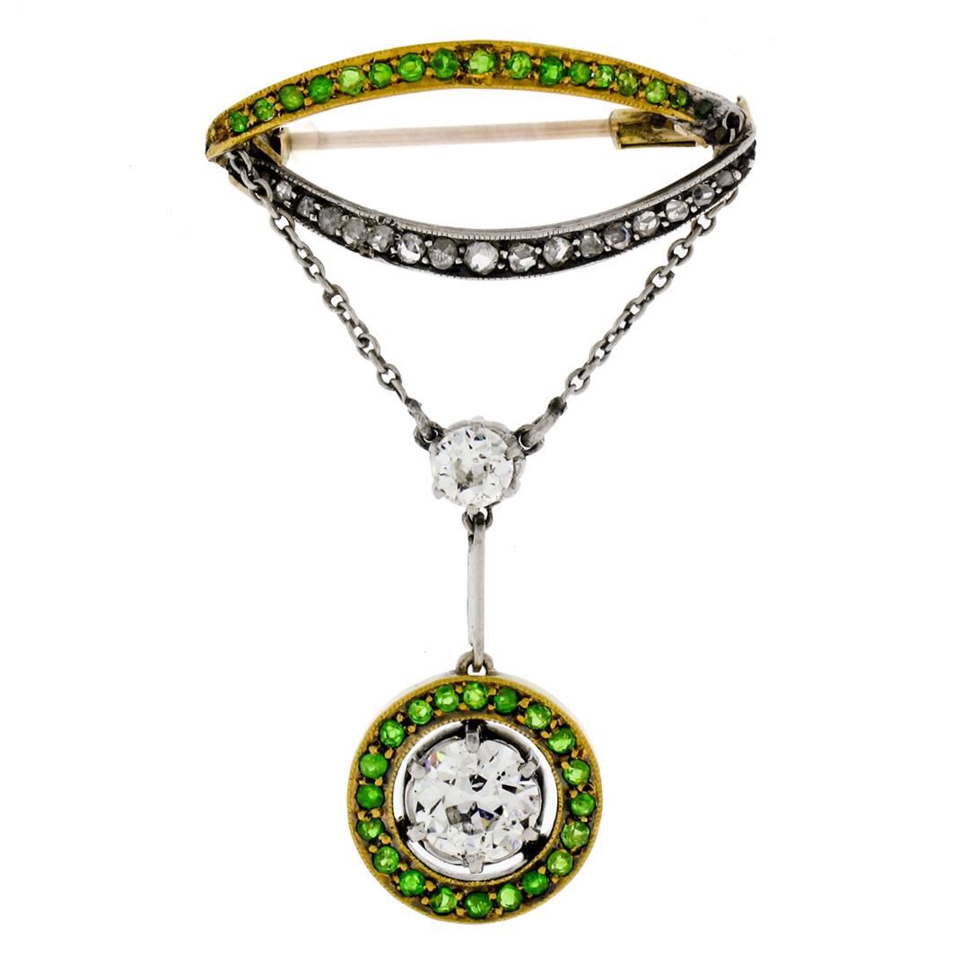 An antique victorian solid 18k yelloe gold and silver pin brooch, featuring 1 Gia certified circular brilliant cut natural diamond (F- I1; 1.17ct), and 17 rose cut natural diamonds (0.35ctw), with 1 old european cut natural diamond (F- SI2 ; 0.35ct), and 37 old cut natural demantoid garnets (0.66ctw). Measures 22.5x14.75mm and weighs a total of 6.89 grams. Comes with all original relevant certifications.