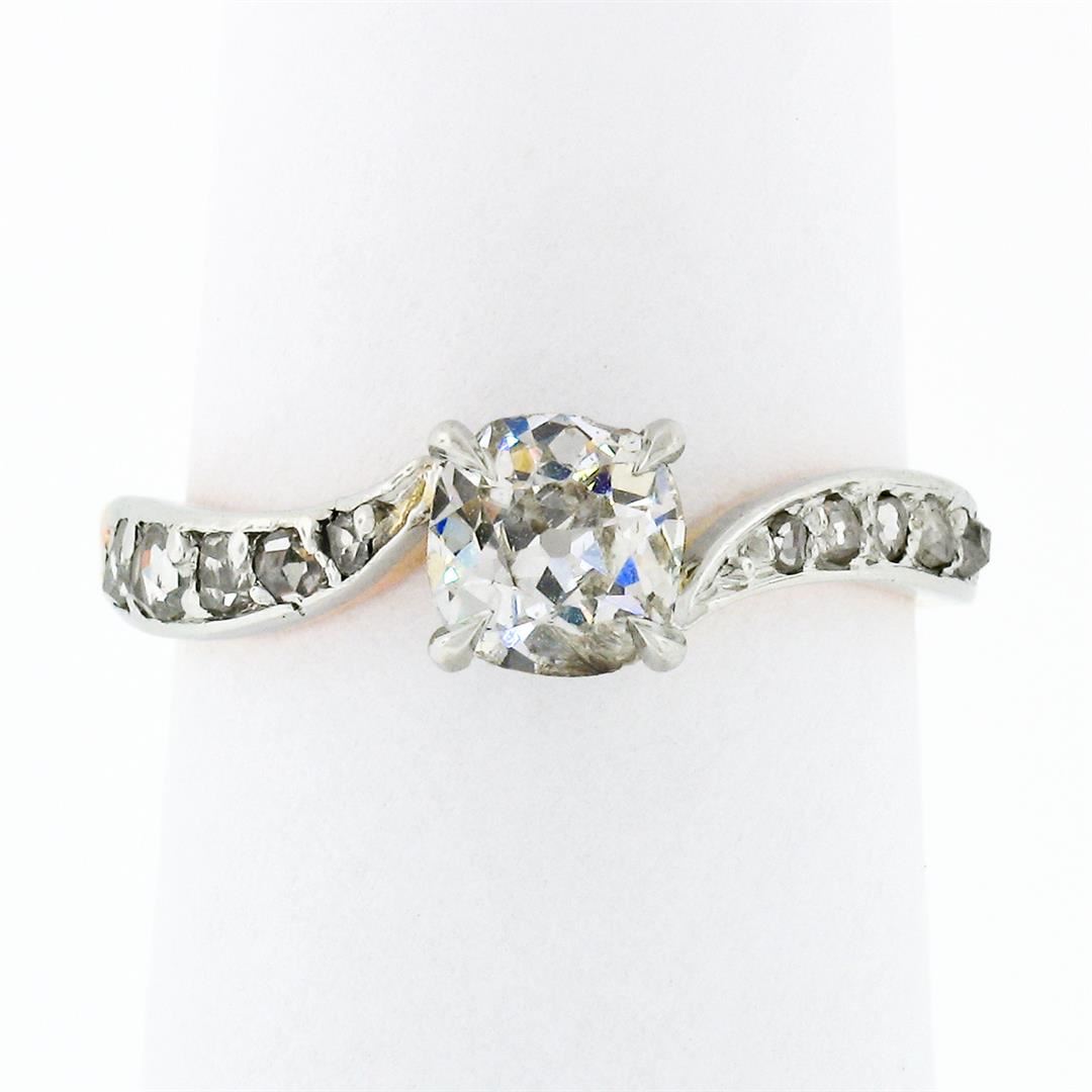 An antique edwardian solid 18k rosy yellow gold & platinum wavy engagement ring, with 1 old mine cushion cut natural diamond (I - SI2 ; 0.75ct ), and 10 old rose cut natural diamonds (H/I - SI1/SI2; 0.15ctw). The ring is size 5, weighs a total of 2.51 grams, and measures 5.35mm wide.