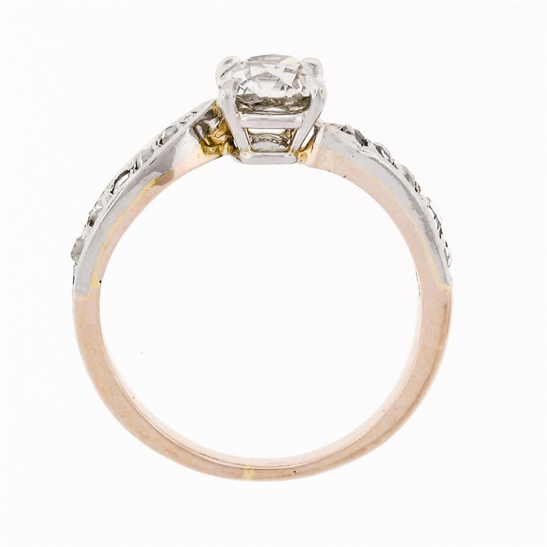 An antique edwardian solid 18k rosy yellow gold & platinum wavy engagement ring, with 1 old mine cushion cut natural diamond (I - SI2 ; 0.75ct ), and 10 old rose cut natural diamonds (H/I - SI1/SI2; 0.15ctw). The ring is size 5, weighs a total of 2.51 grams, and measures 5.35mm wide.