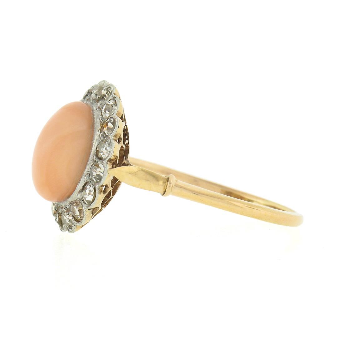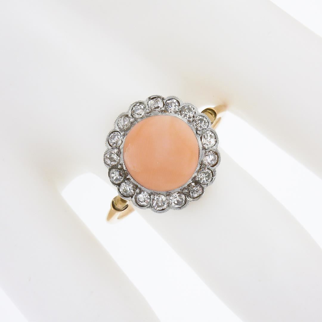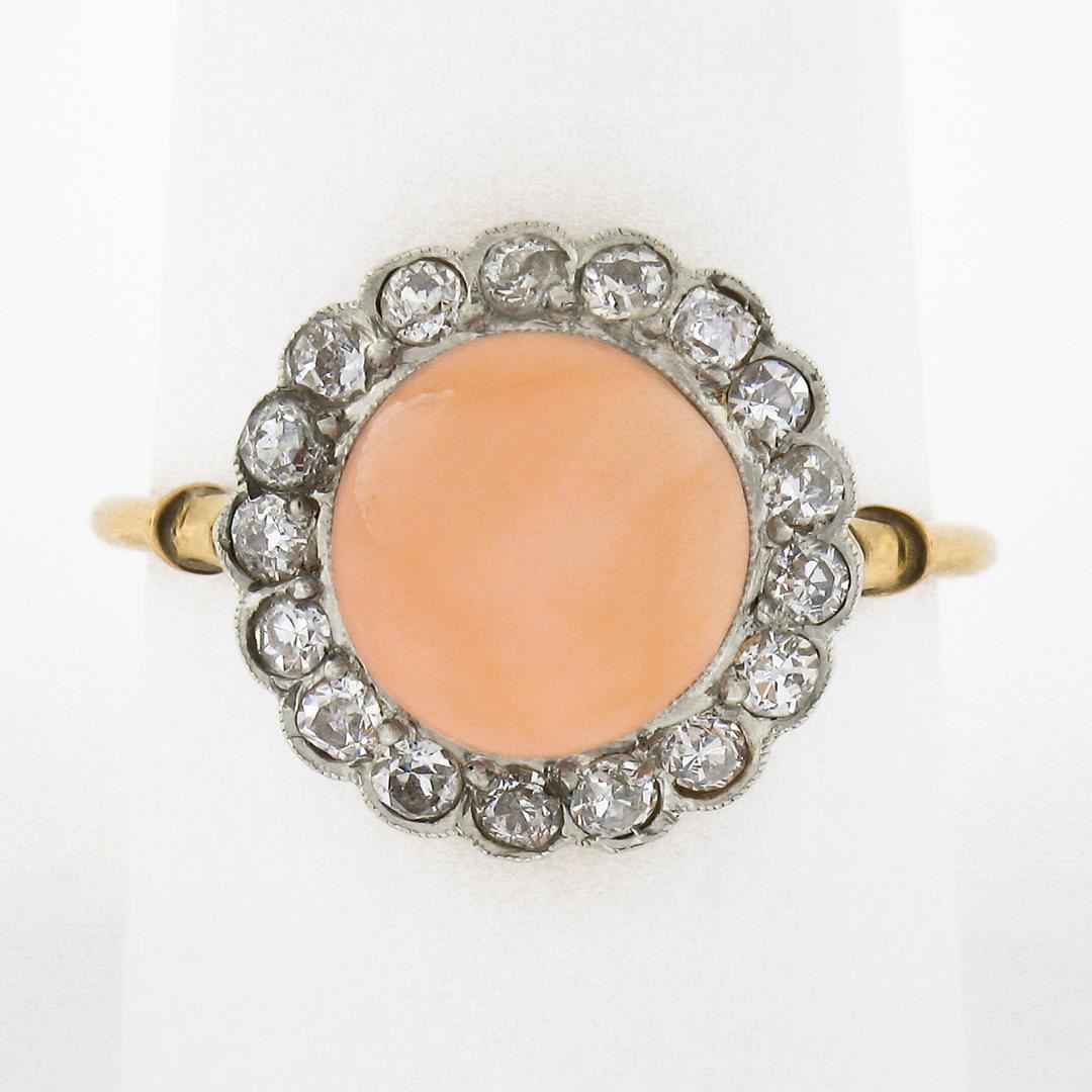 An antique solid 18k yellow gold & platinum ring, with 1 button cut natural coral (9.7mm), surrounded with a halo of 17 old mine & old single cut natural diamonds (H/K - SI1/I1 ; 0.50ctw). The ring is size 9.0, weighs a total of 3.22 grams, and measures 14.7mm wide.