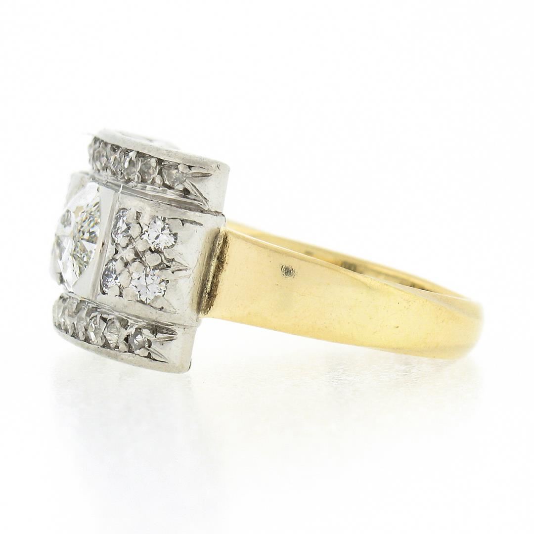 An antique solid 18k yellow gold & platinum platter ring, with 1 GIA graded oval cut natural diamond (G - SI1 ; 1.10ct ), and 30 old rose & old European cut natural diamonds (G/H - SI1/SI2 ; 0.30ctw). The ring is size 6.0, weighs a total of 7.46 grams, and measures 10.7mm wide. Comes with all original relevant certifications.