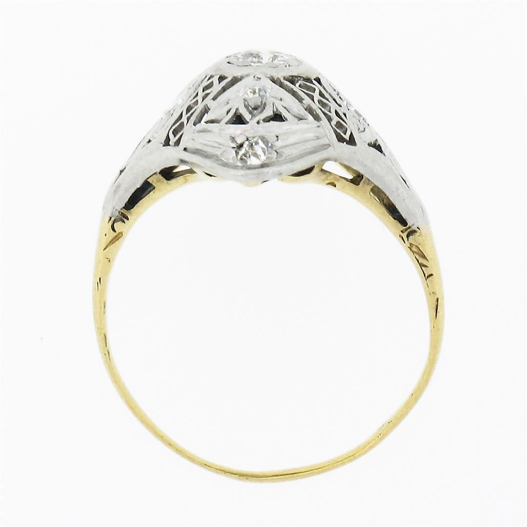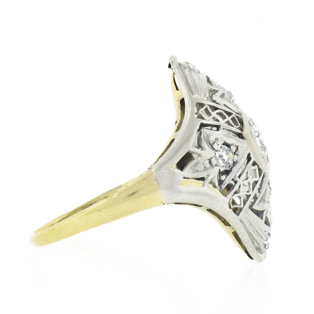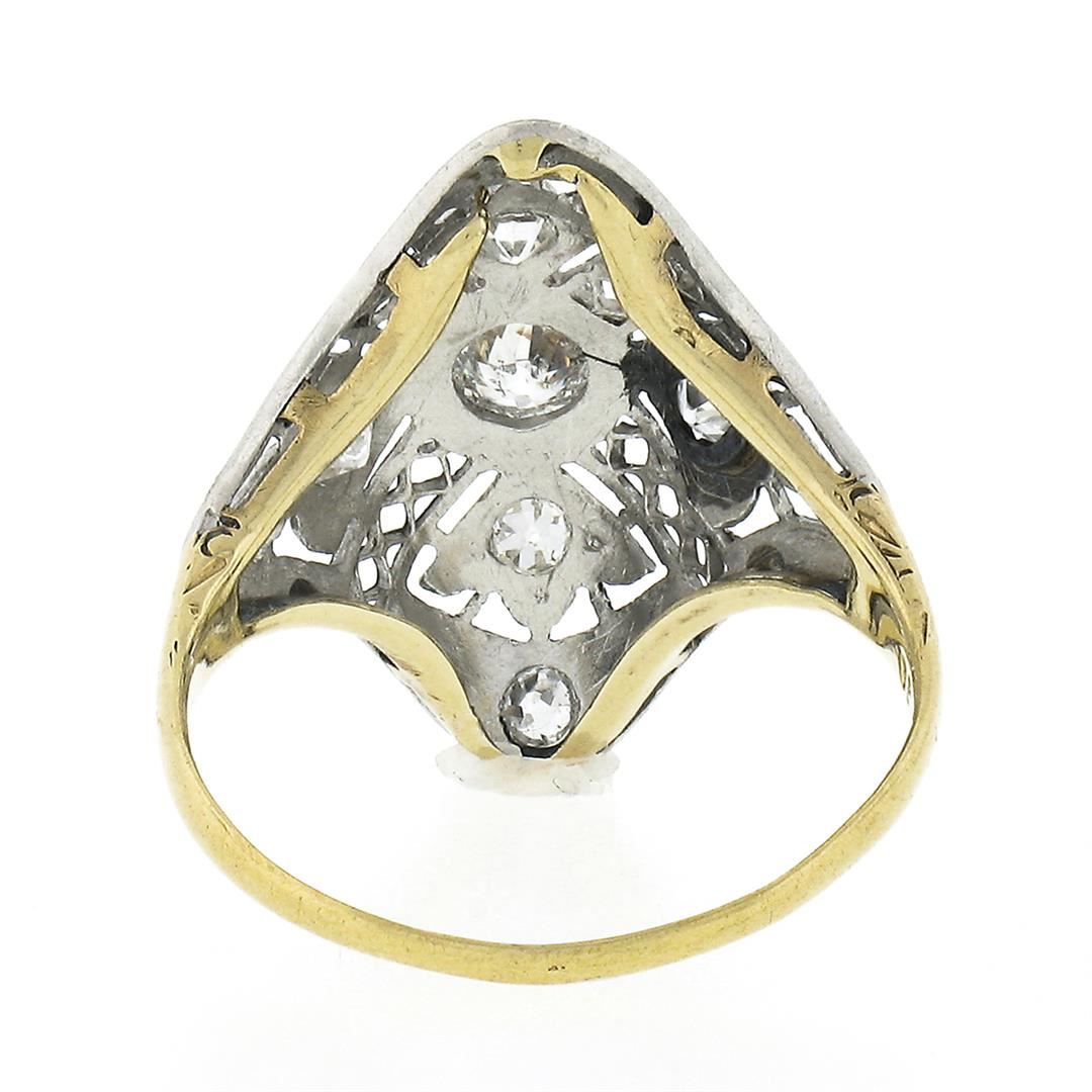 An antique solid 18k yellow gold & platinum dinner ring, with 7 old cut natural diamonds (G-I - VS2-I1 ; 0.20ctw). The ring is size 3.0, weighs a total of 1.85 grams, and measures 16.90mm wide.