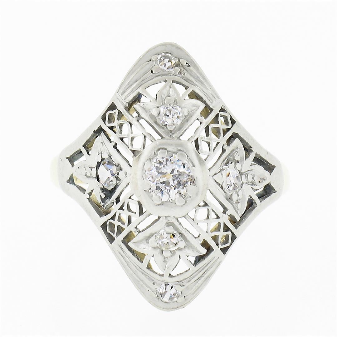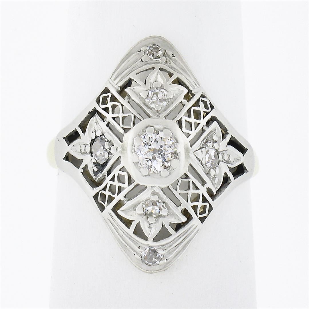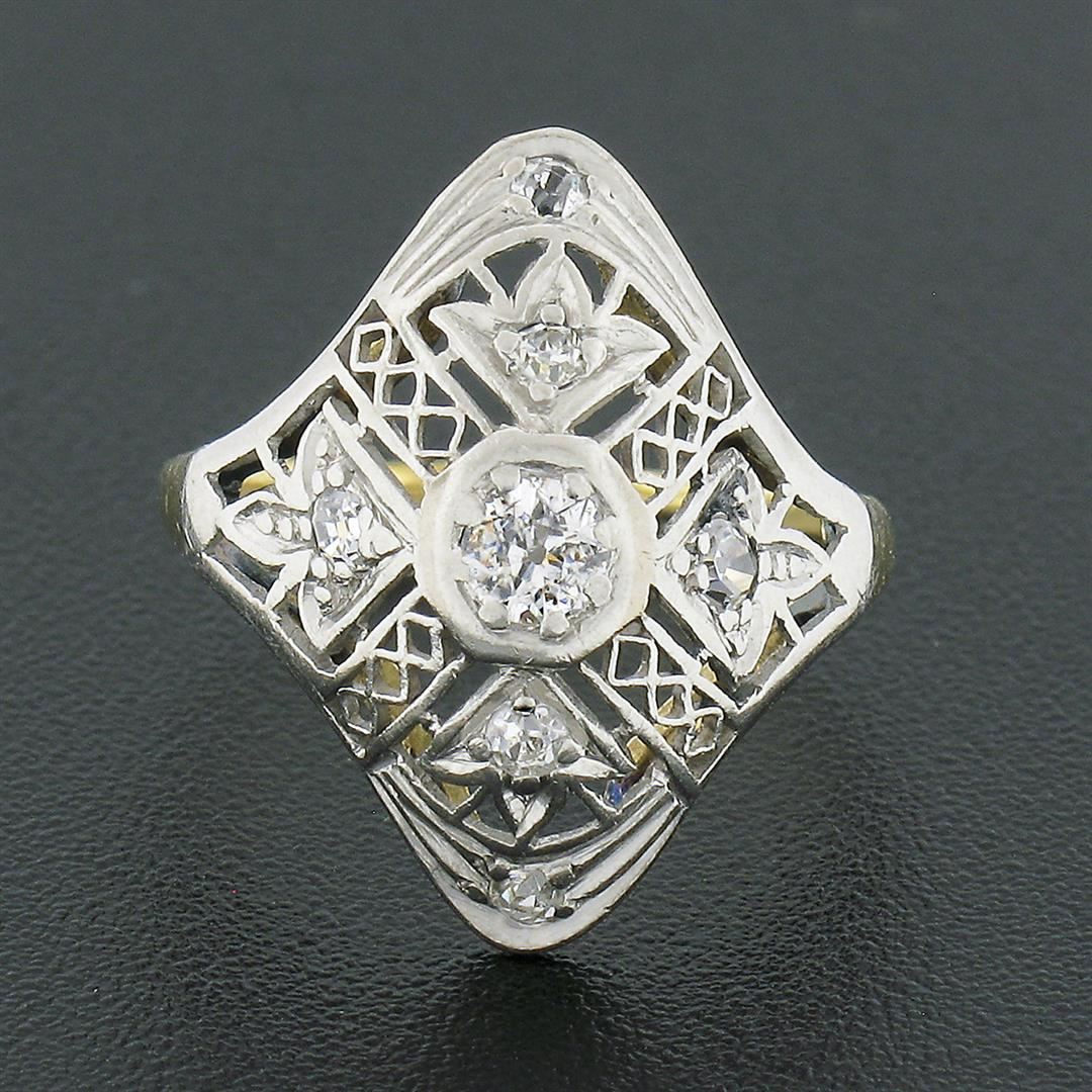 An antique solid 18k yellow gold & platinum dinner ring, with 7 old cut natural diamonds (G-I - VS2-I1 ; 0.20ctw). The ring is size 3.0, weighs a total of 1.85 grams, and measures 16.90mm wide.