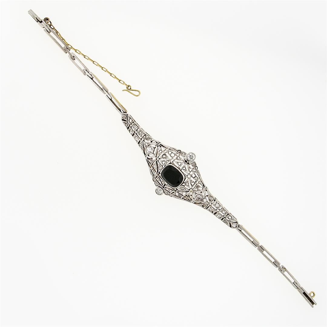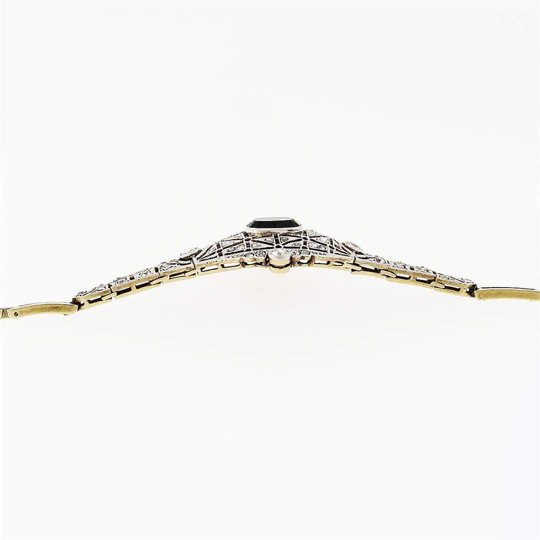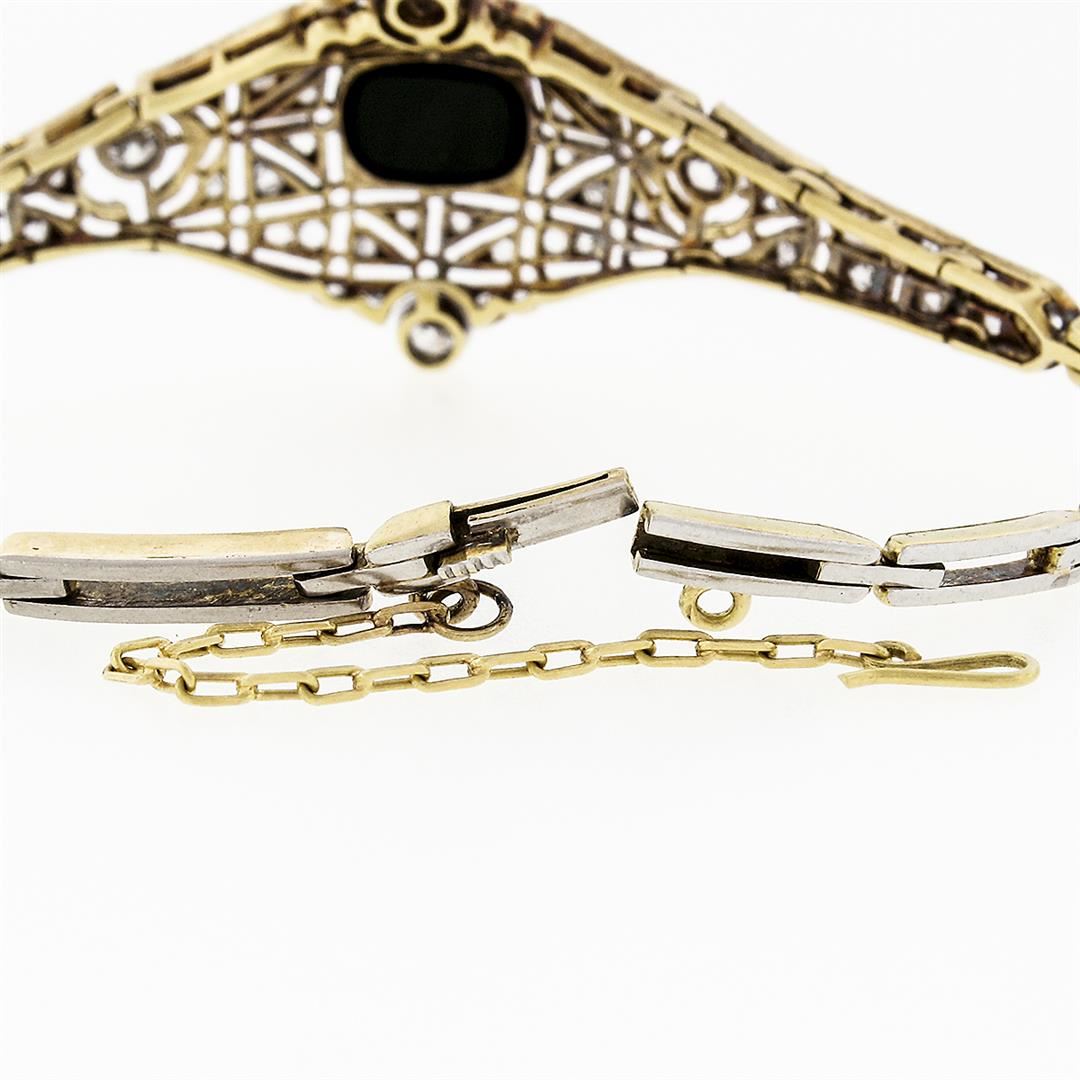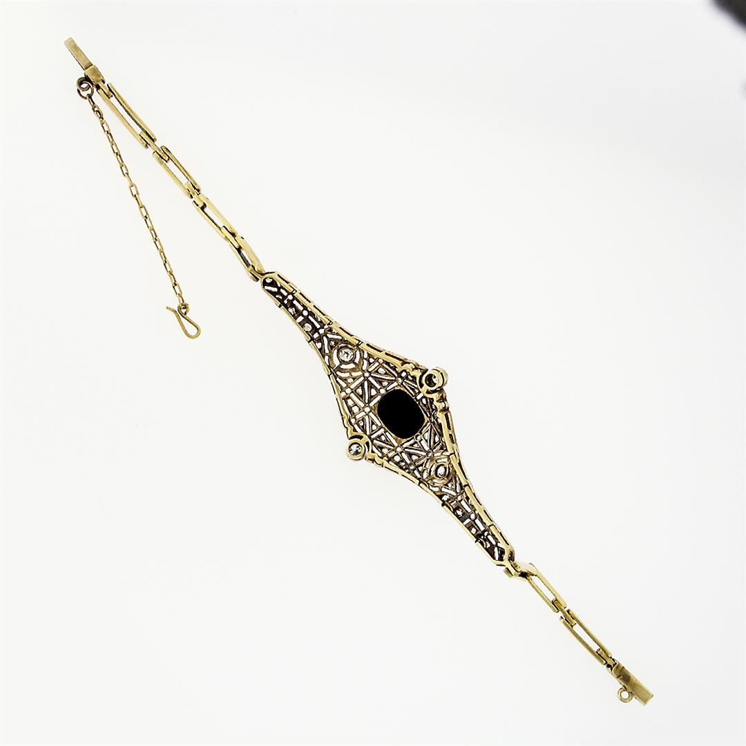 An antique solid 18k yellow gold & platinum belly bracelet. with 1 cushion cut black onyx (9.94x7.88mm), and 4 old european cut natural diamonds (G - VS2/SI1 ; 0.44ctw). It weighs a total of 18.90 grams, measures 25.78mm wide, and measures 7.25 inches in length.