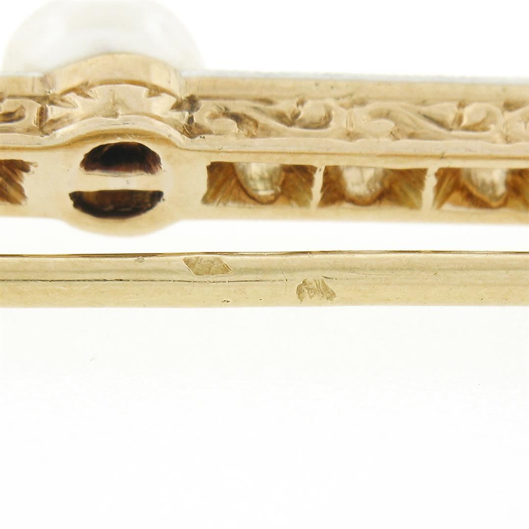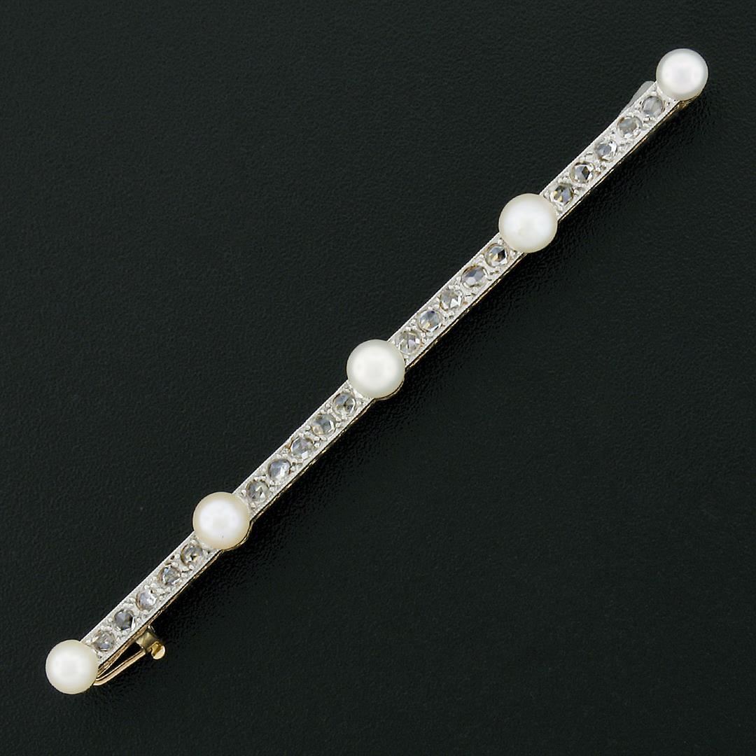 An antique solid 18k yellow gold and platinum bar pin brooch, with 5 round shape cultured pearls (4mm to 4.6mm each), and 20 rose cut natural diamonds (G/H - VS2/SI2 ; 0.80ctw). Measures 70.30x4.60mm and weighs a total of 6.20 grams.