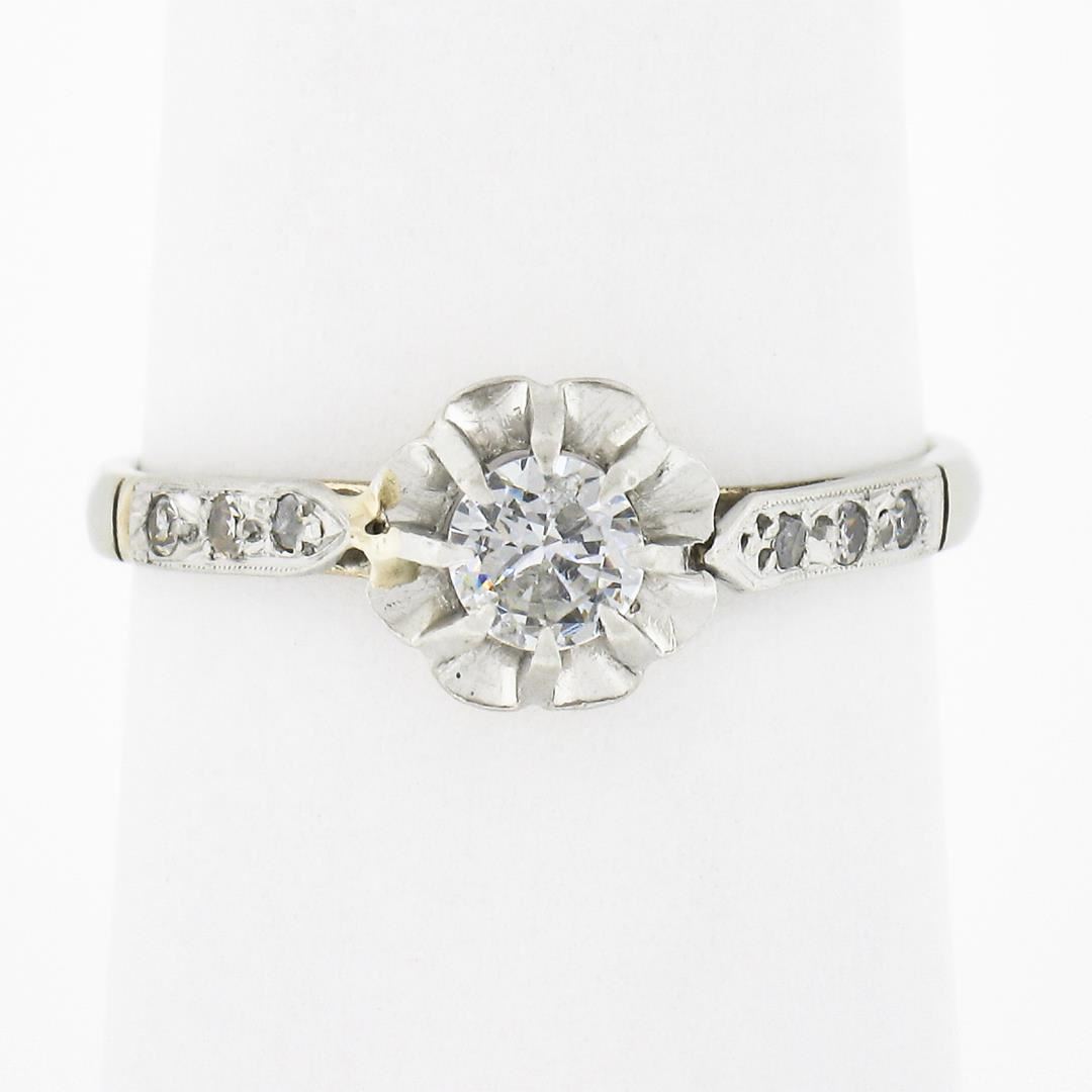 An antique solid 18k white gold & platinum french engagement ring, featuring 1 old transitional cut natural diamond (H/I - I1 ; 0.25ct ), accented with 6 old rose & old single cut natural diamonds (H-J - SI2-I2 ; 0.06ctw). The ring is size 7.0, weighs a total of 2.0 grams, and measures 7mm wide.