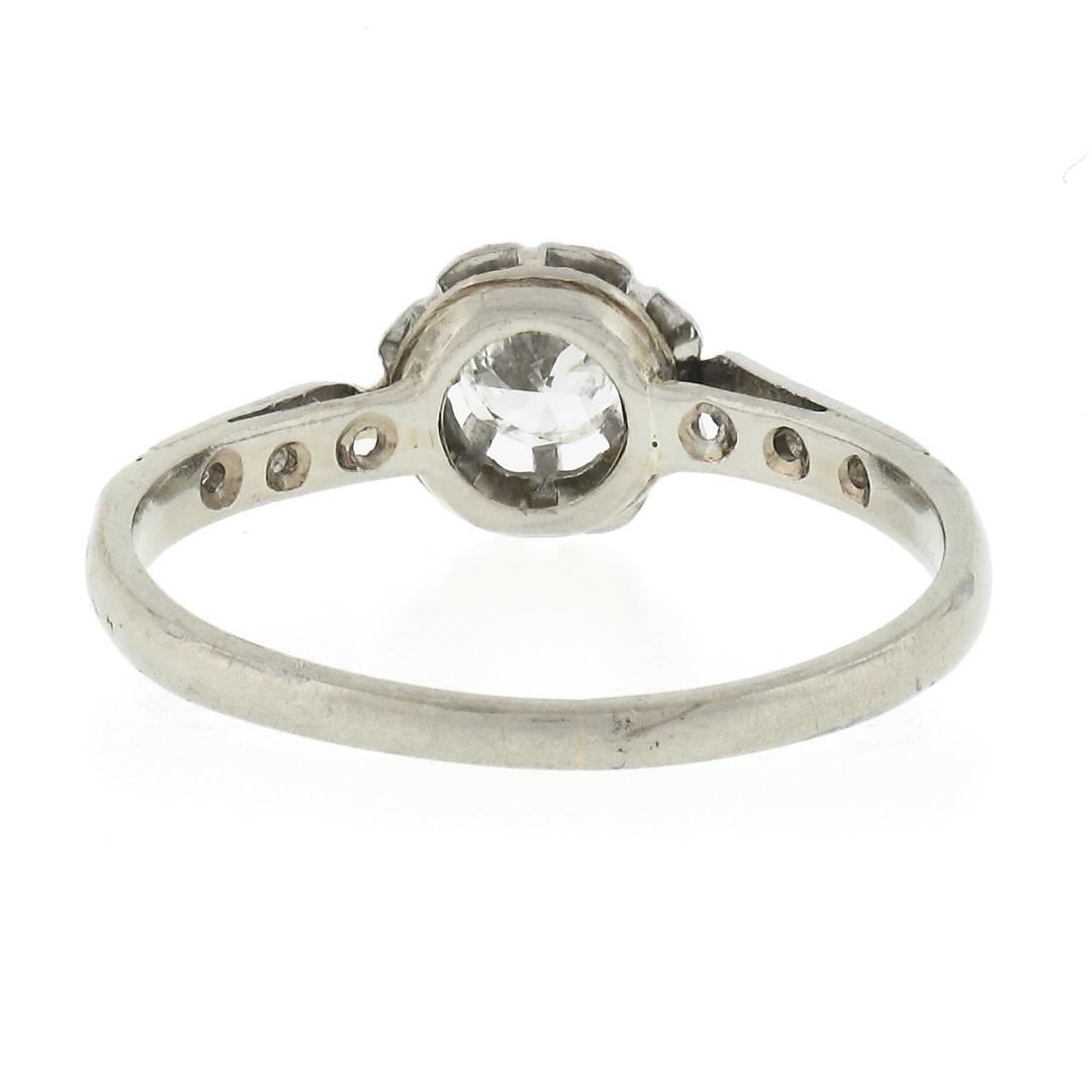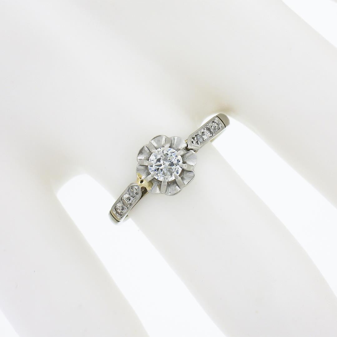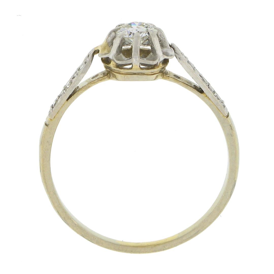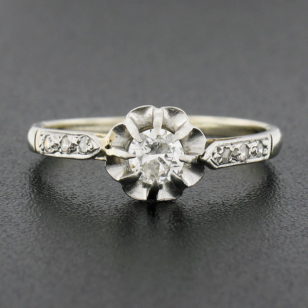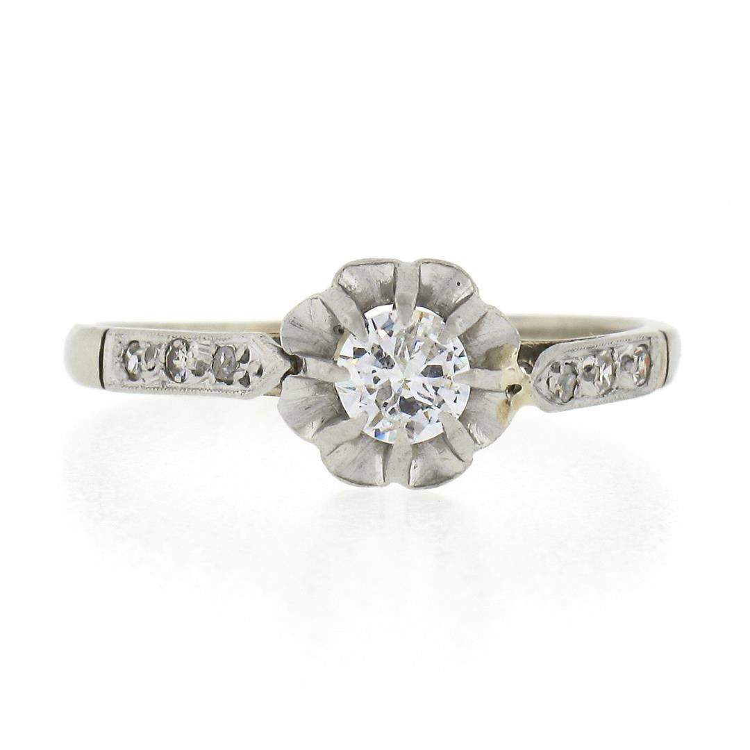 An antique solid 18k white gold & platinum french engagement ring, featuring 1 old transitional cut natural diamond (H/I - I1 ; 0.25ct ), accented with 6 old rose & old single cut natural diamonds (H-J - SI2-I2 ; 0.06ctw). The ring is size 7.0, weighs a total of 2.0 grams, and measures 7mm wide.