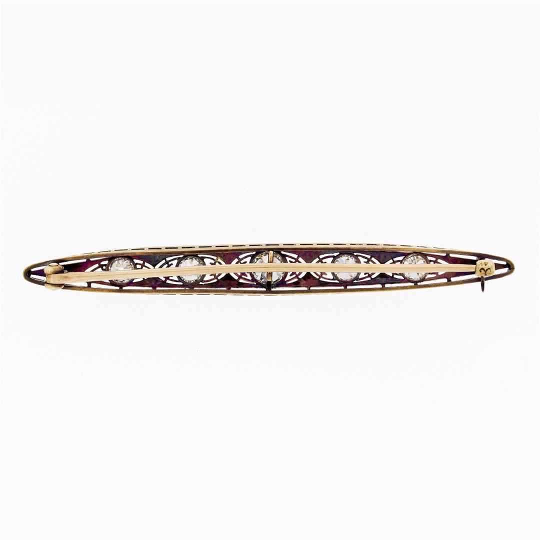 An antique erdwardian solid 14k yellow and whiye gold bar pin brooch, with 5 old european cut natural diamonds (G/H- VS1/VS2; 1.64ctw). Measures 70.6x7.5mm and weighs a total of 6.05 grams.