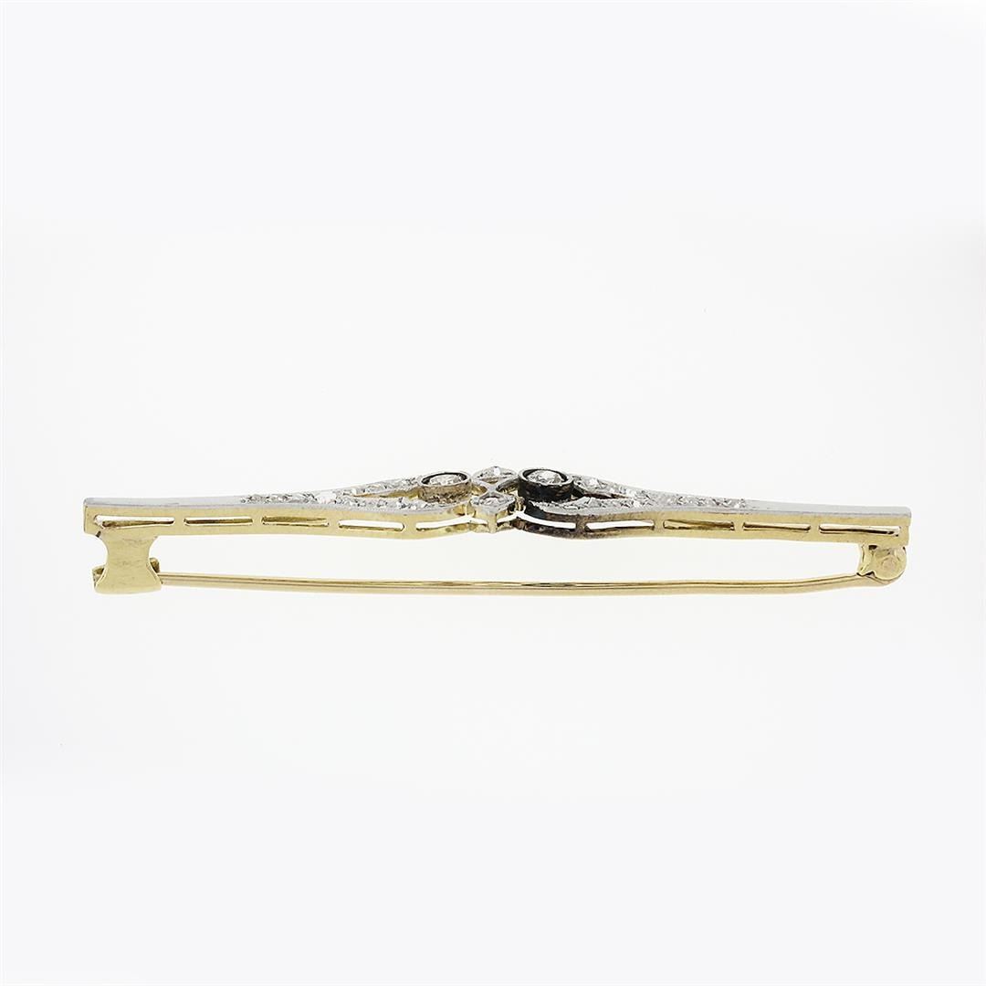An antique edwardian solid platinum & 18k yellow gold bar pin brooch, with 28 old rose & european cut natural diamonds (G/J - VS2/SI2 ; 0.55ctw). Measures 10.65x56.9mm and weighs a total of 4.27 grams.