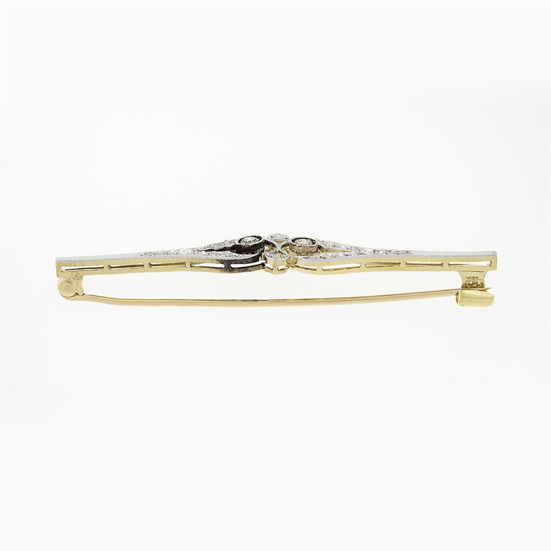 An antique edwardian solid platinum & 18k yellow gold bar pin brooch, with 28 old rose & european cut natural diamonds (G/J - VS2/SI2 ; 0.55ctw). Measures 10.65x56.9mm and weighs a total of 4.27 grams.