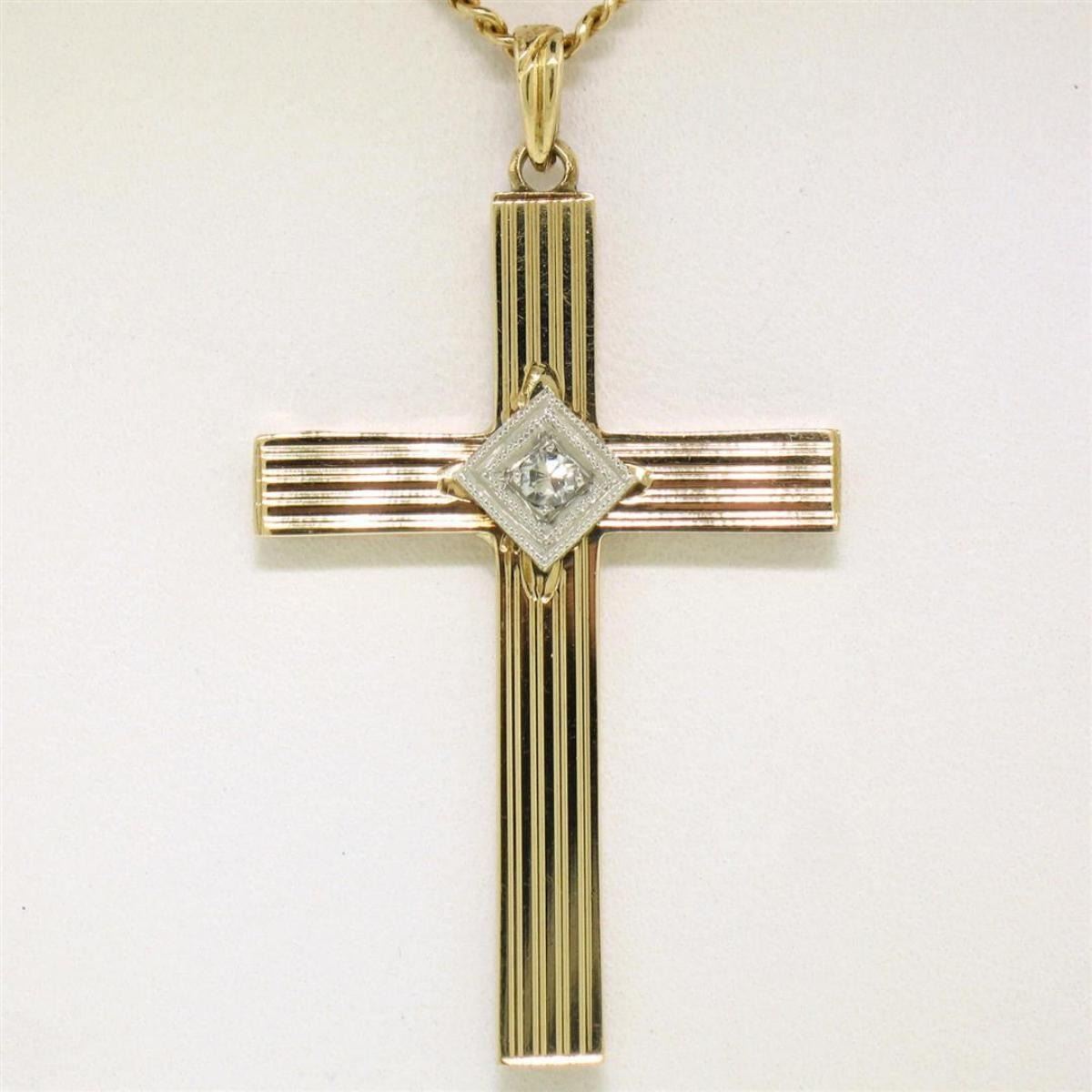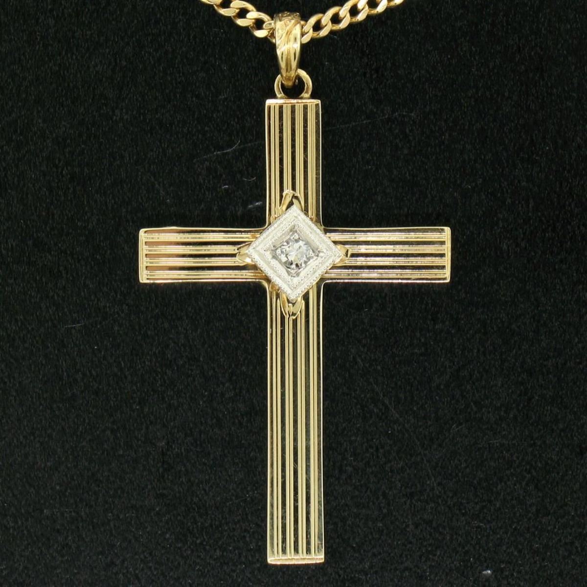 An antique 14kt yellow and white gold cross pendant crafted by Esemco featuring a 0.06ct round single cut diamond (G - VS2). 19 inch fine curb link chain, 5.32 grams total weight, pendant measures 36.30x20.55mm with the bail.