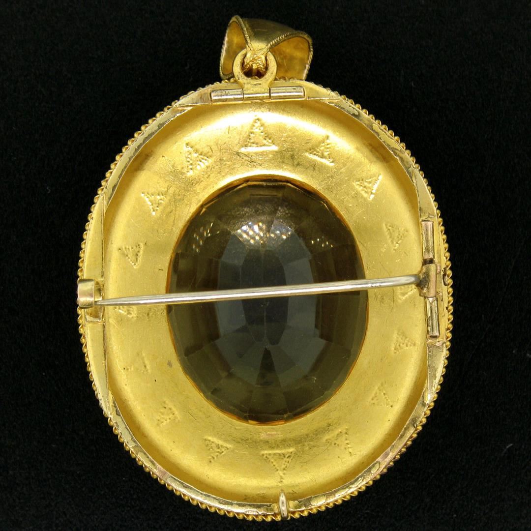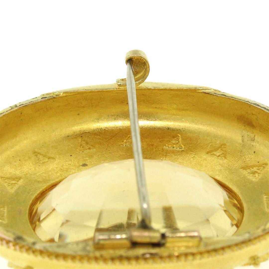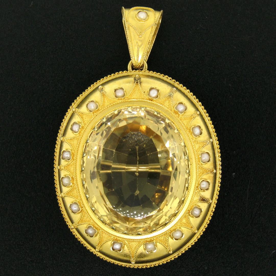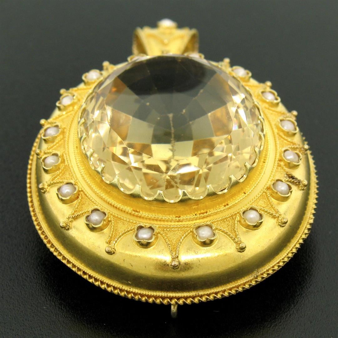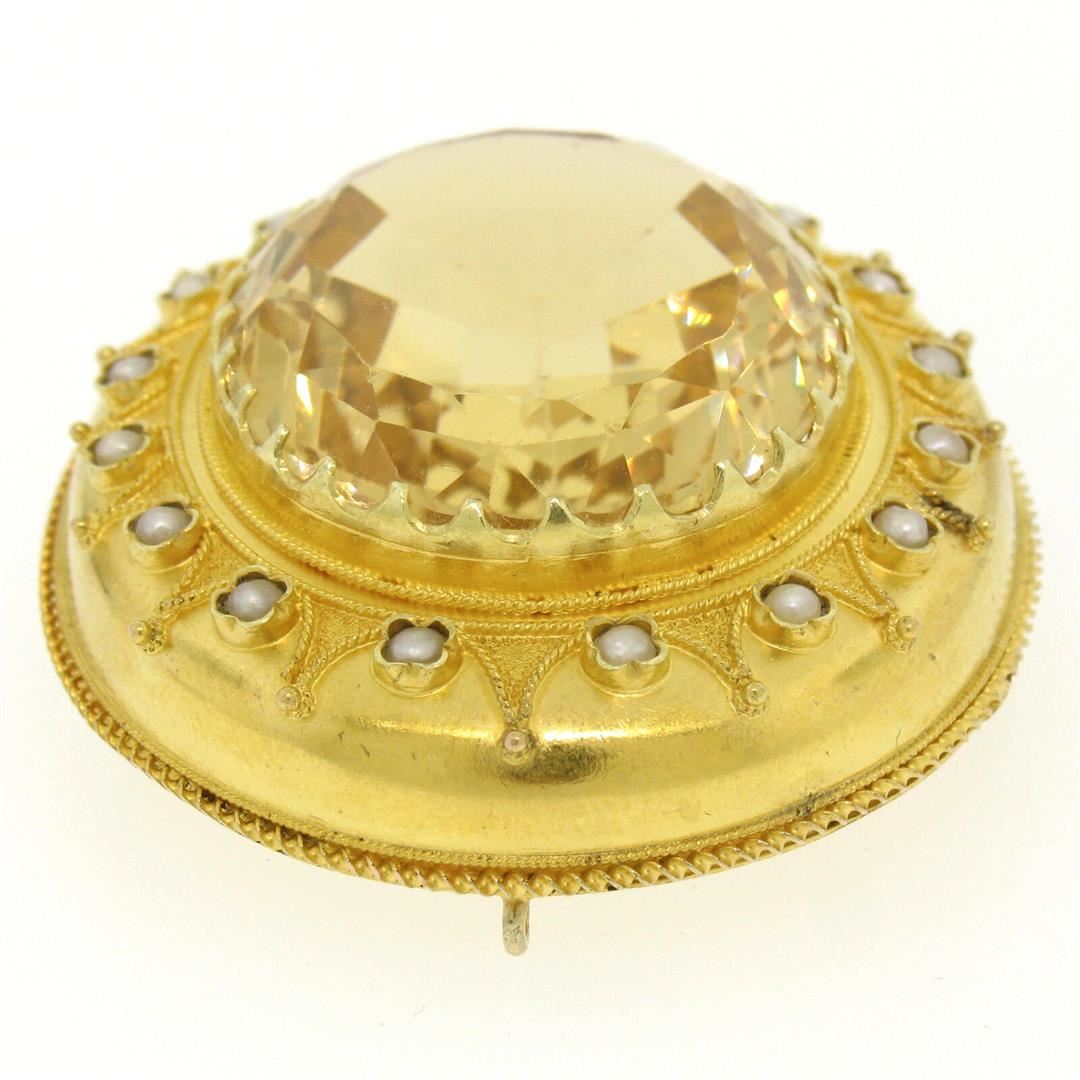 An antique etruscan solid 14k yellow gold brooch or pendant, 1 oval cut natural citrine (28.41x23.71mm), and a halo of 17 round shape natural seed pearls (2.25mm). Measures 61.60x39.25mm and weighs a total of 22.0 grams.