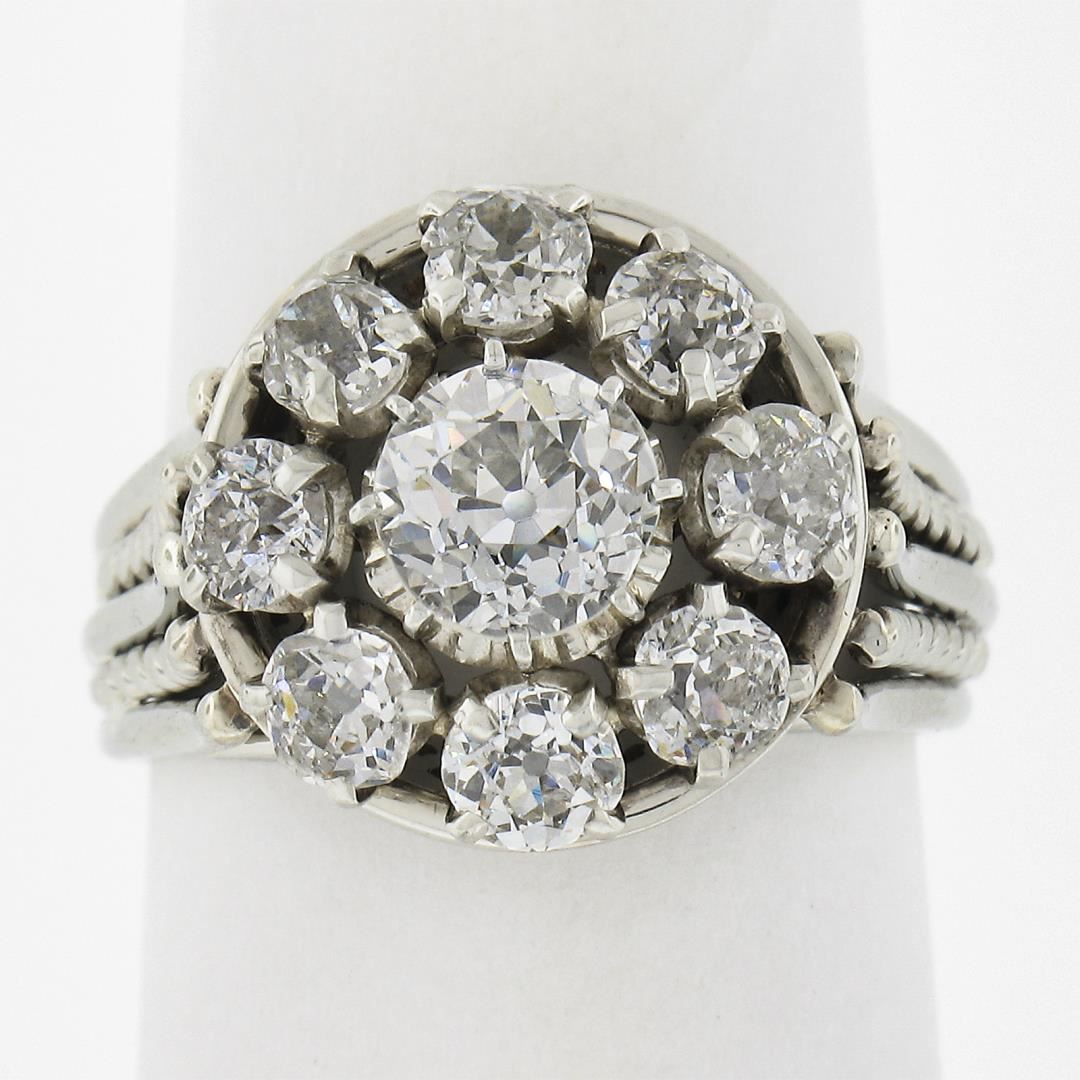 An antique french solid 18k white gold flower ring, with 1 GIA graded old european cut (J - VS1 ; 0.84ct ), surrouded with 8 old chunky european & old mine cut natural diamonds ( H/I - VS2/SI1 ; 1.28ctw). The ring is size 5.5, weighs a total of 6.93 grams, and measures 13.6mm wide. Comes with all original relevant certifications.