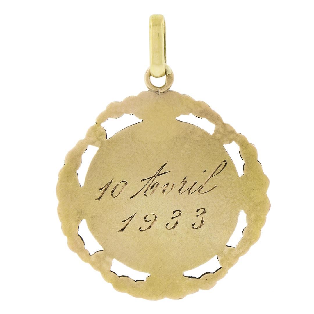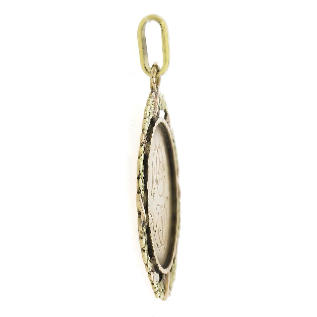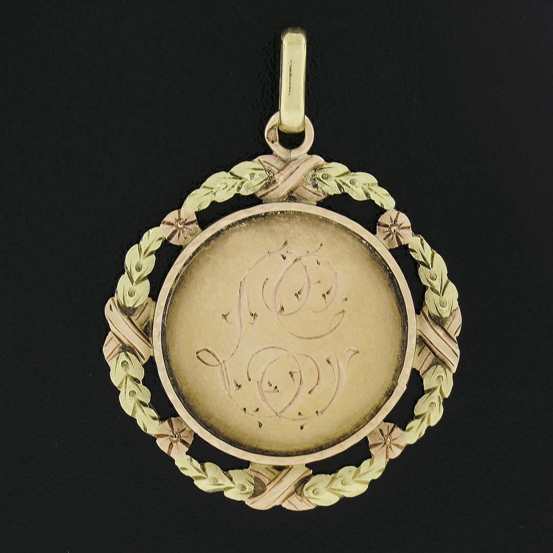 An antique solid 18k tri color gold pendant. The pendant weighs a total of 2.04 grams, measures 32.2x24mm including the bail, and the inside of the bail measures 4.5x2.1mm.