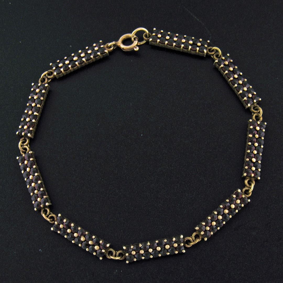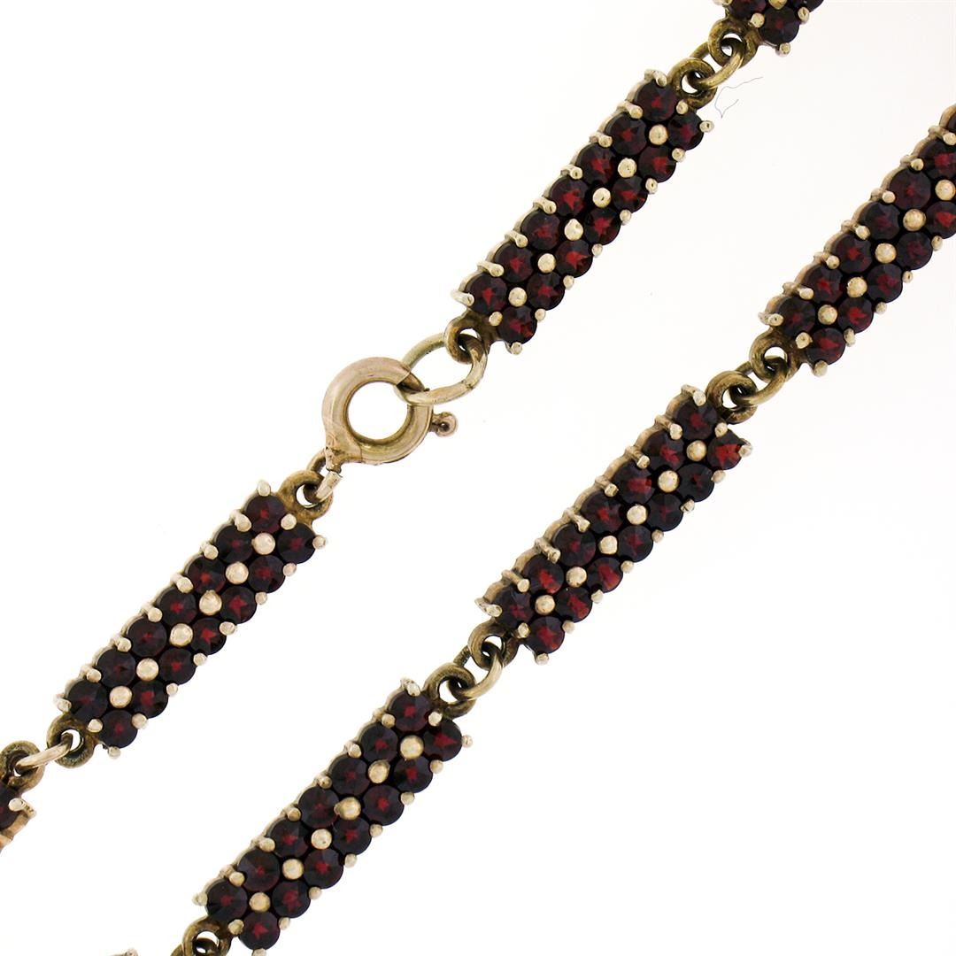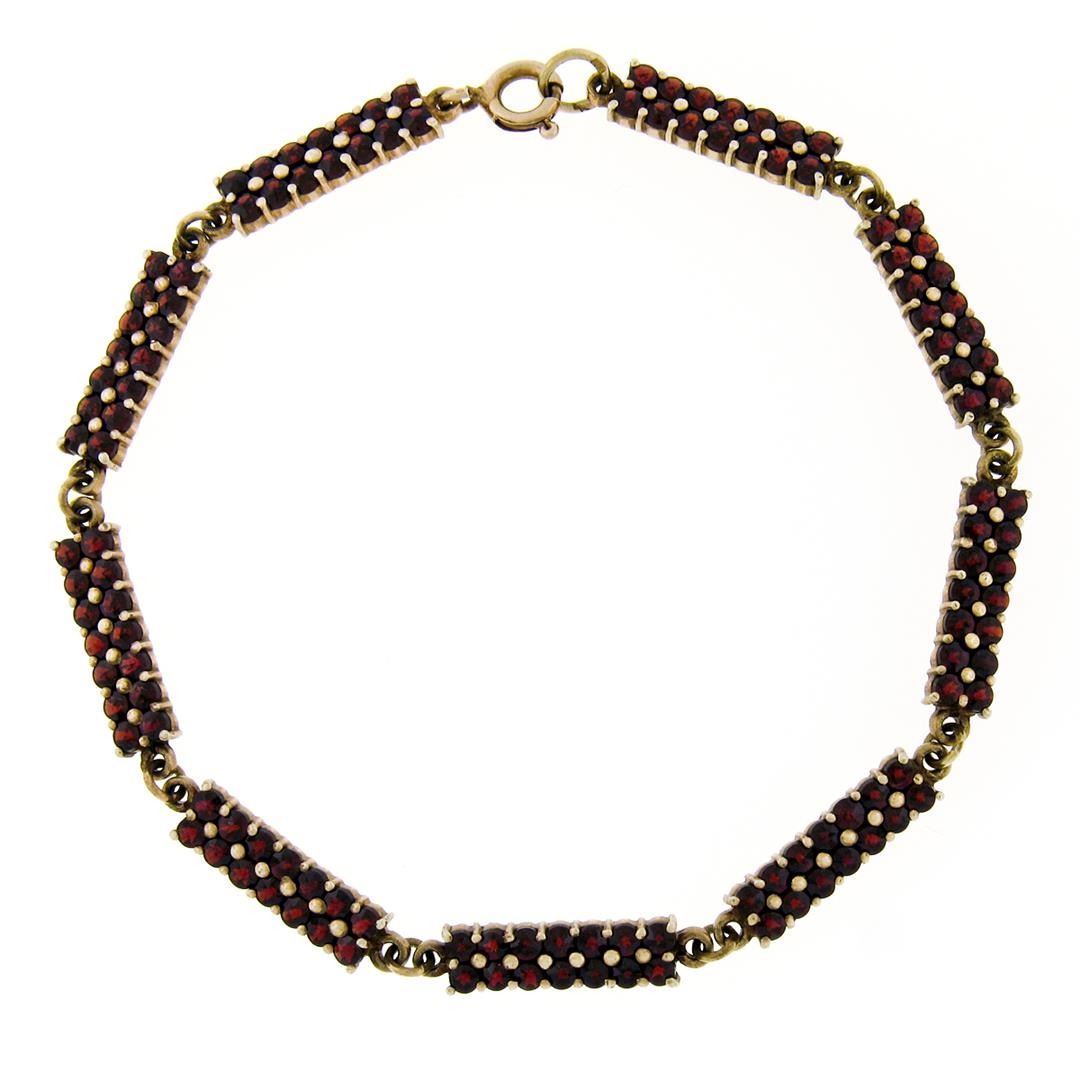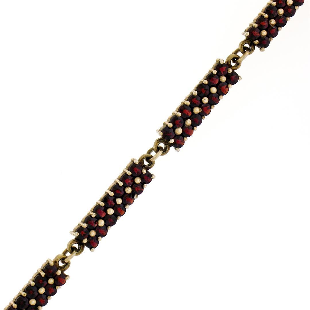 An antique solid Gilded Silver tennis bracelet, featuring 126 old round cut natural bohemian garnets (6.30ctw ). It weighs a total of 10.1 grams, measures 5.0mm wide, and measures 8.0 inches in length.
