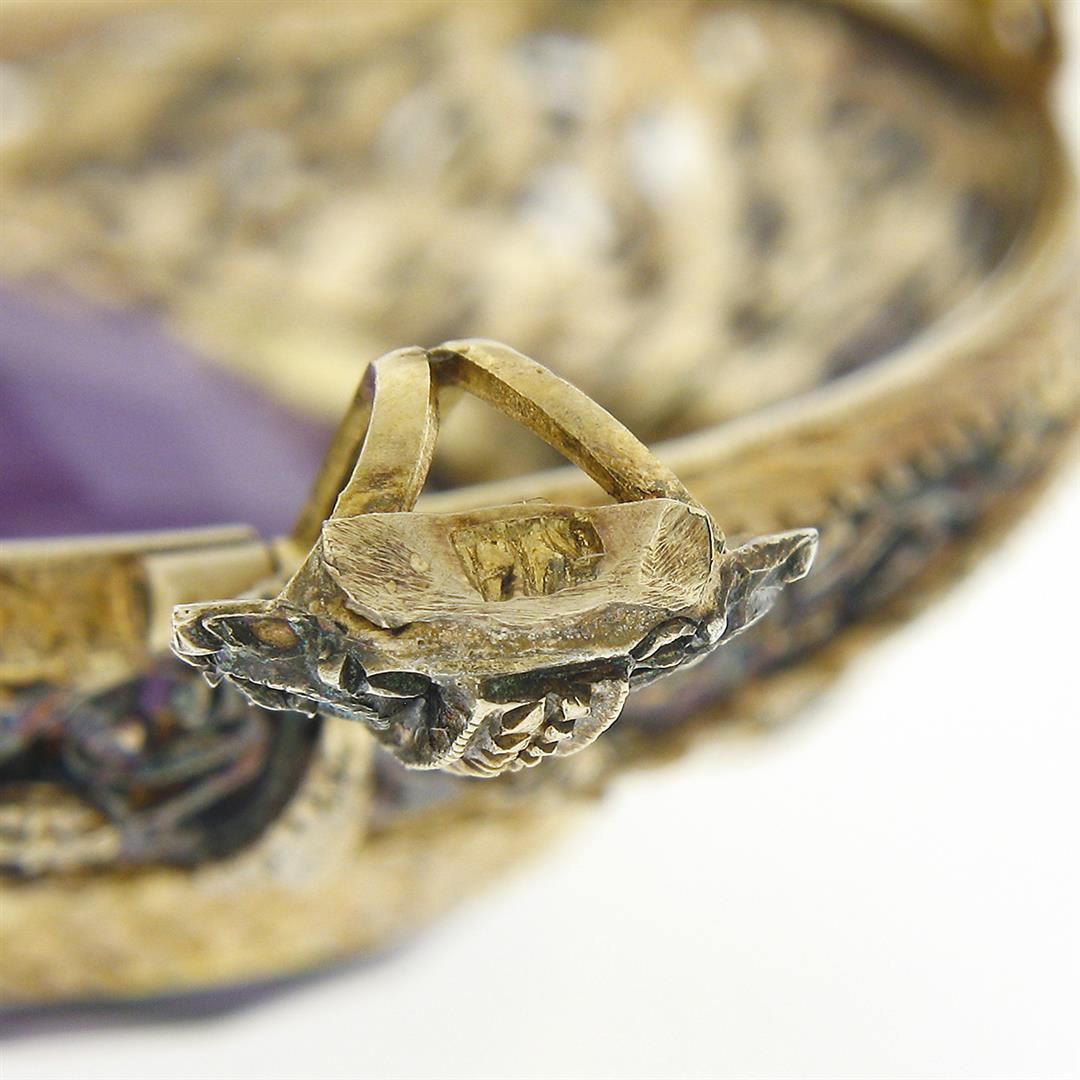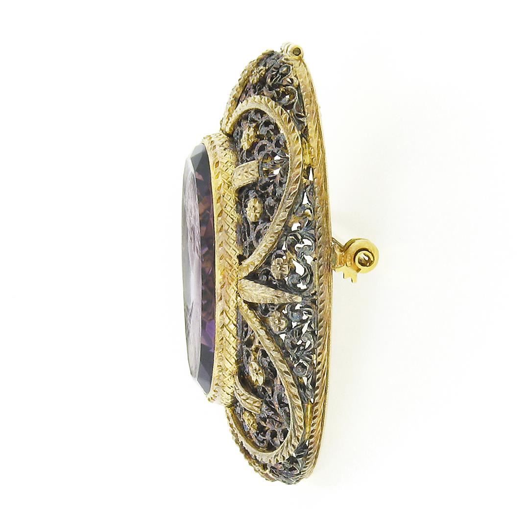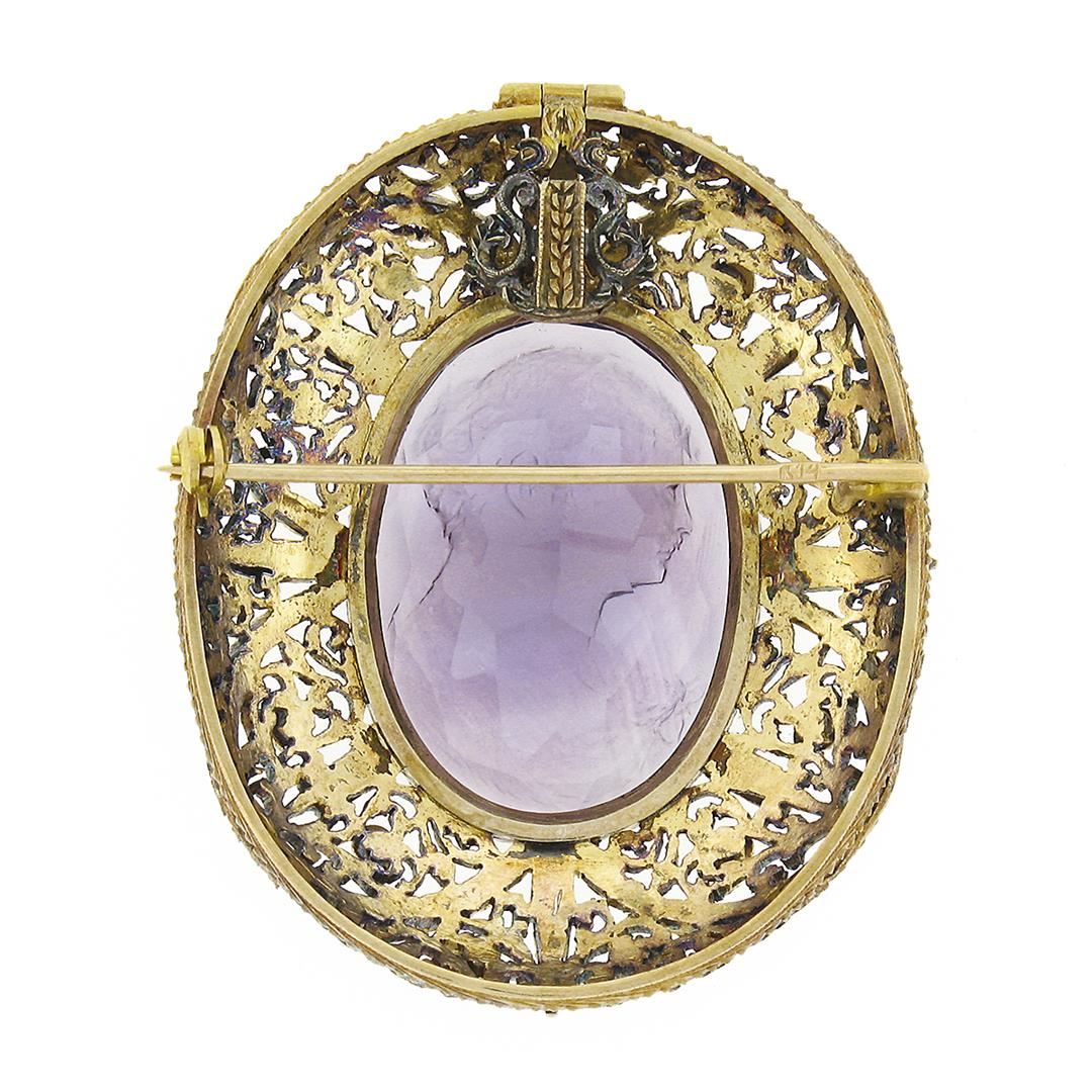 An antique solid 14k yellow gold brooch or pendant by Giovanni Apa, with 1 oval shape hand carved cameo natural amethyst (27.50ct). Measures 47.15x38.75mm and weighs a total of 22.81 grams.