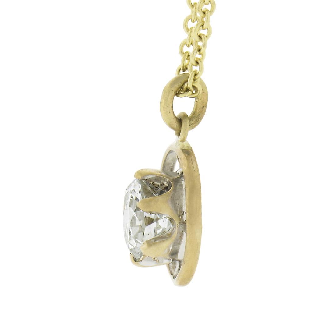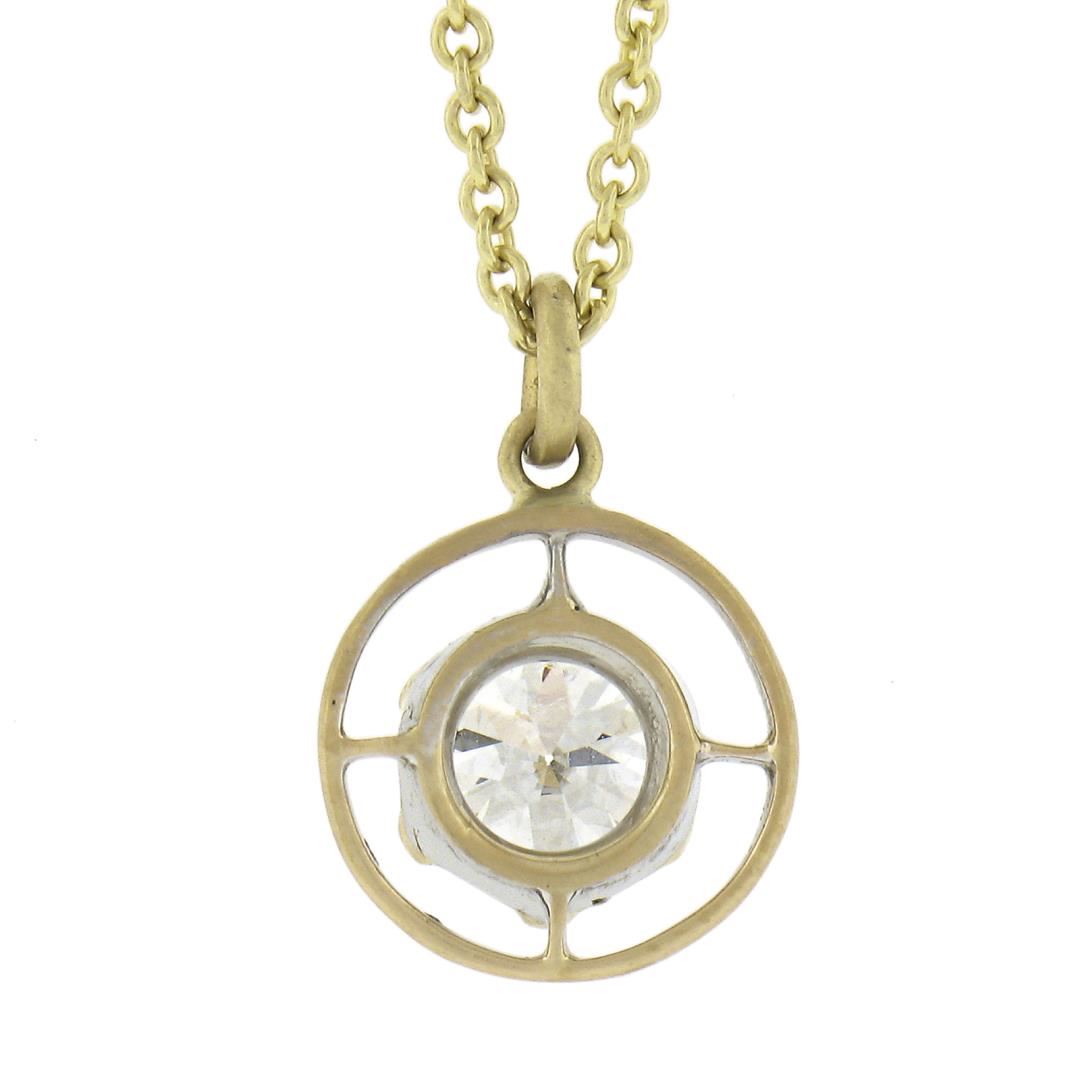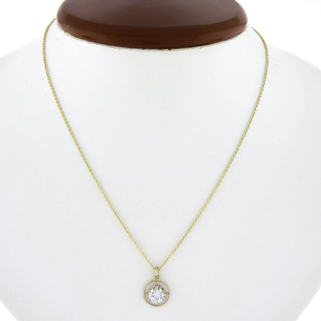 An antique solid 14k yellow gold pendant necklace, with 1 GIA round cut natural diamond (E - VS2 ; 0.69ct ). 18 inch cable link chain, 3.22 grams total weight, pendant measures 13.6x9.8mm. Comes with all original relevant certifications.