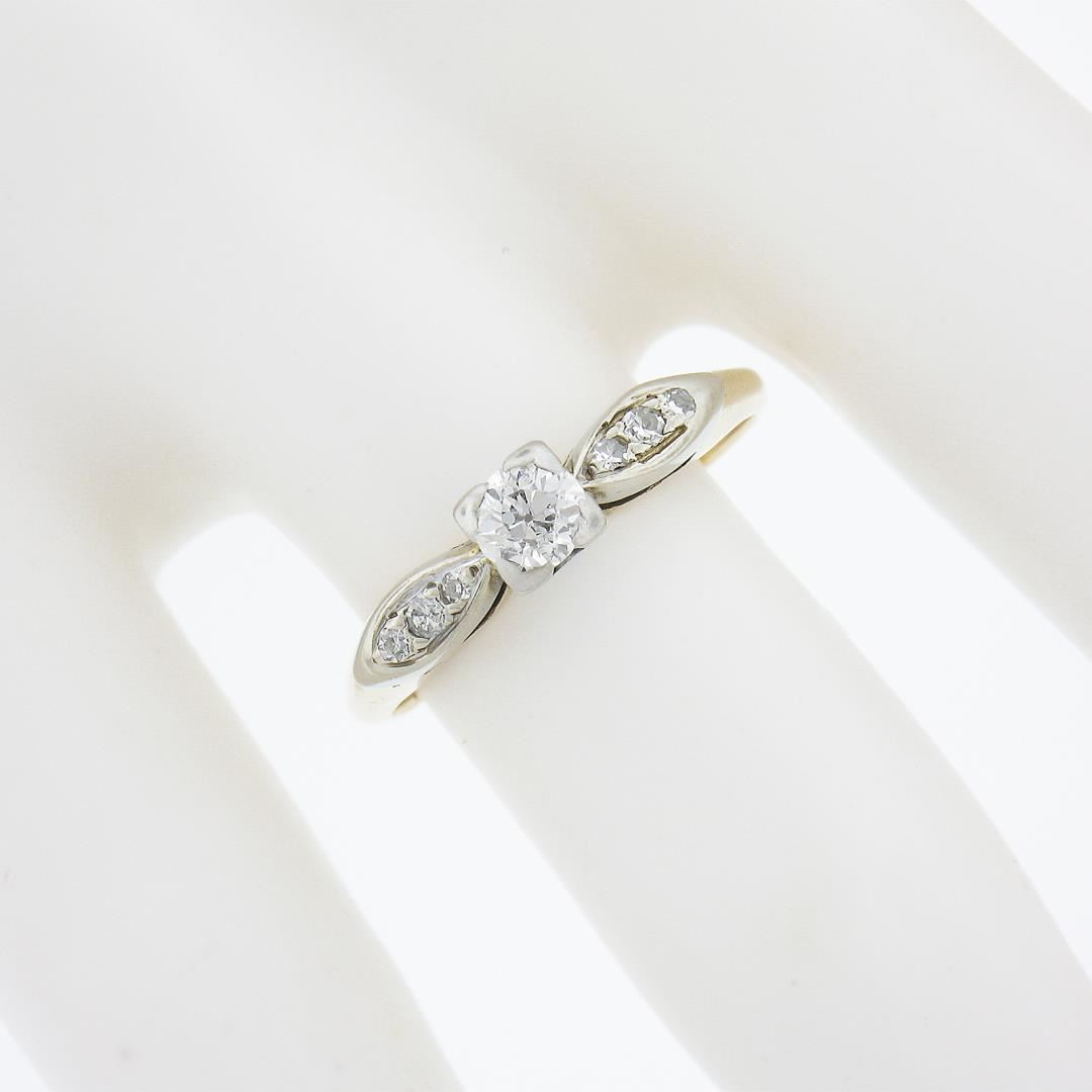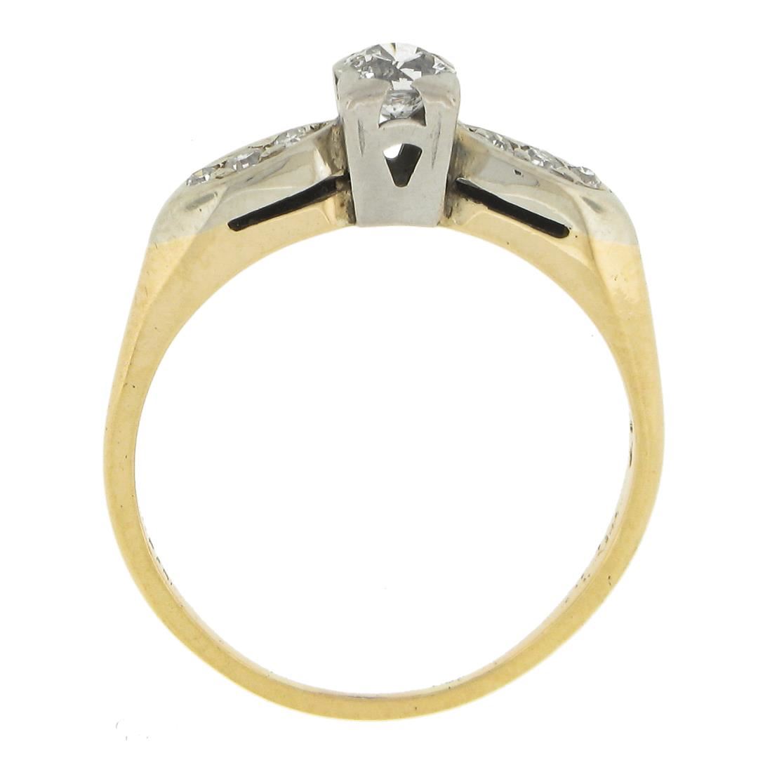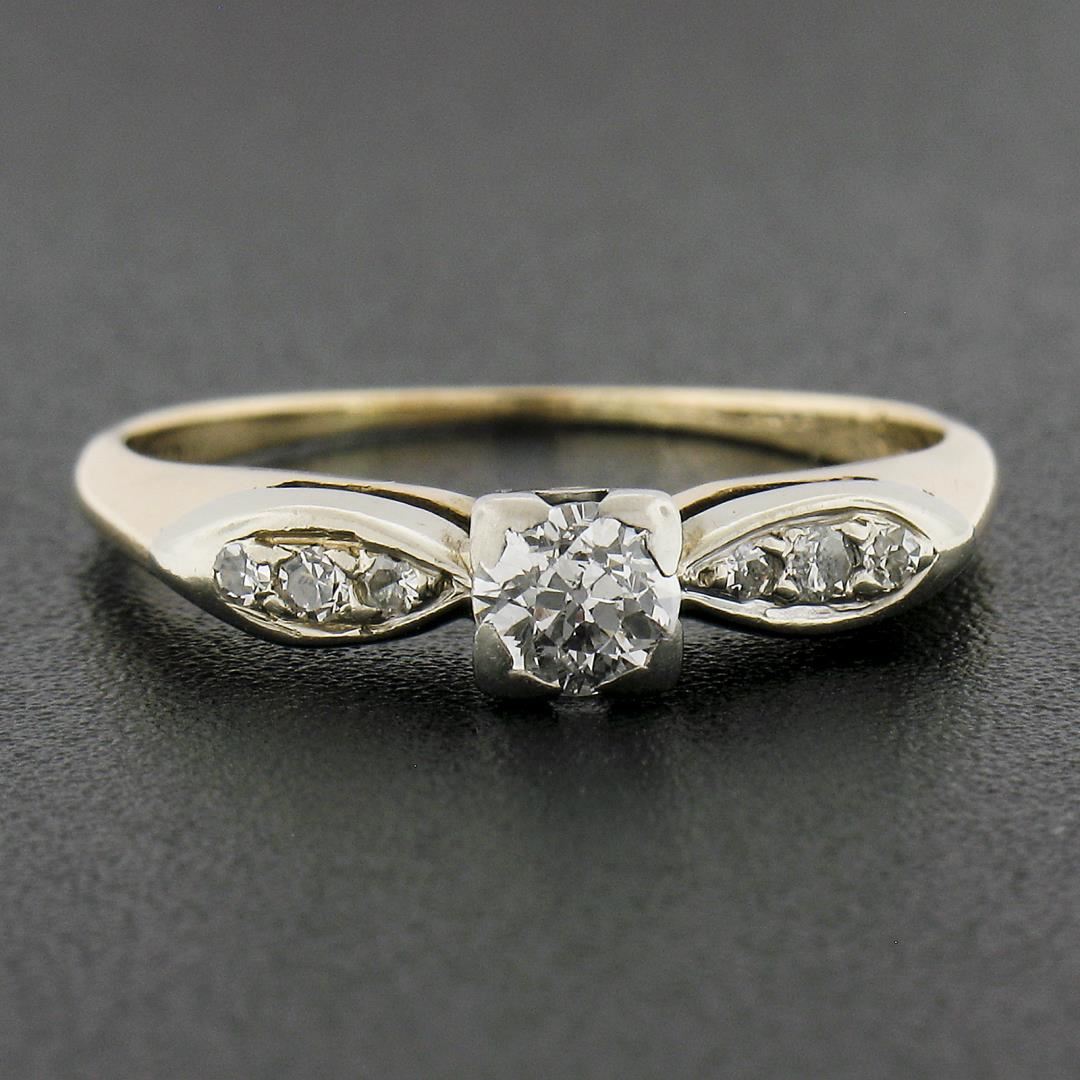 An antiuqe solid 14k yellow gold & palladium engagement ring, with old european cut natural diamond (G - SI1 ; 0.28ct), and 6 old single cut natural diamonds (G-I - VS2-SI2 ; 0.5ctw). The ring is size 7.0, weighs a total of 2.18 grams, and measures 4.2mm wide.
