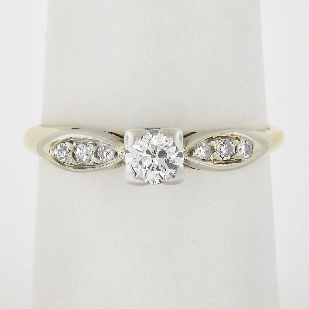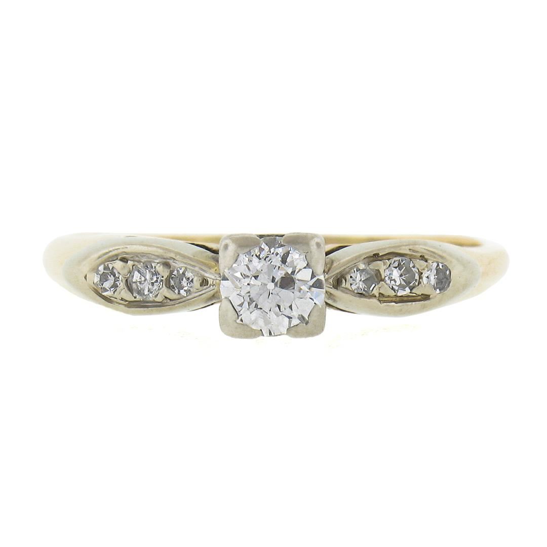 An antiuqe solid 14k yellow gold & palladium engagement ring, with old european cut natural diamond (G - SI1 ; 0.28ct), and 6 old single cut natural diamonds (G-I - VS2-SI2 ; 0.5ctw). The ring is size 7.0, weighs a total of 2.18 grams, and measures 4.2mm wide.