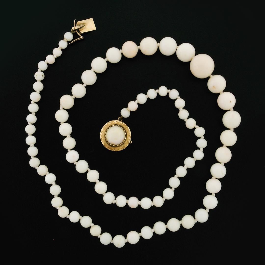 An antique bead coral necklace with 14k yellow gold clasp. 21 inch bead link chain, 34.42 grams total weight.