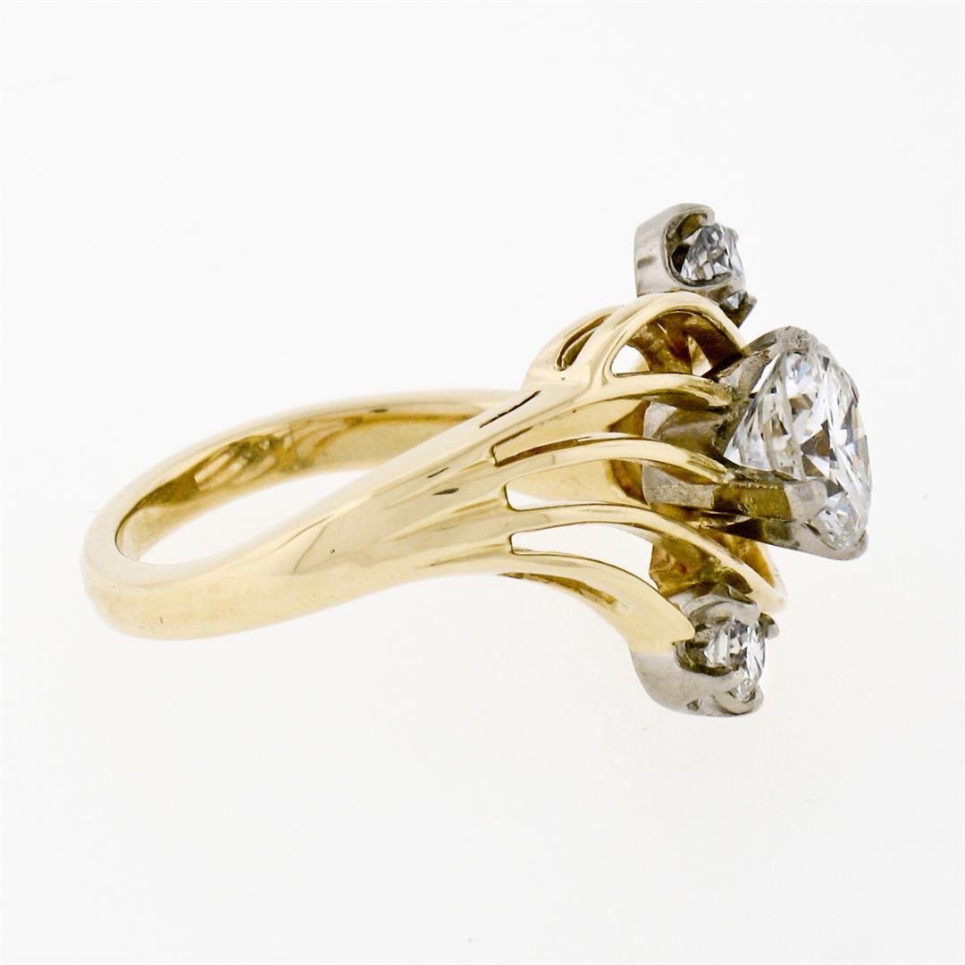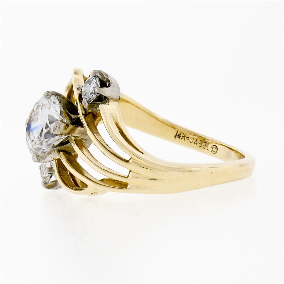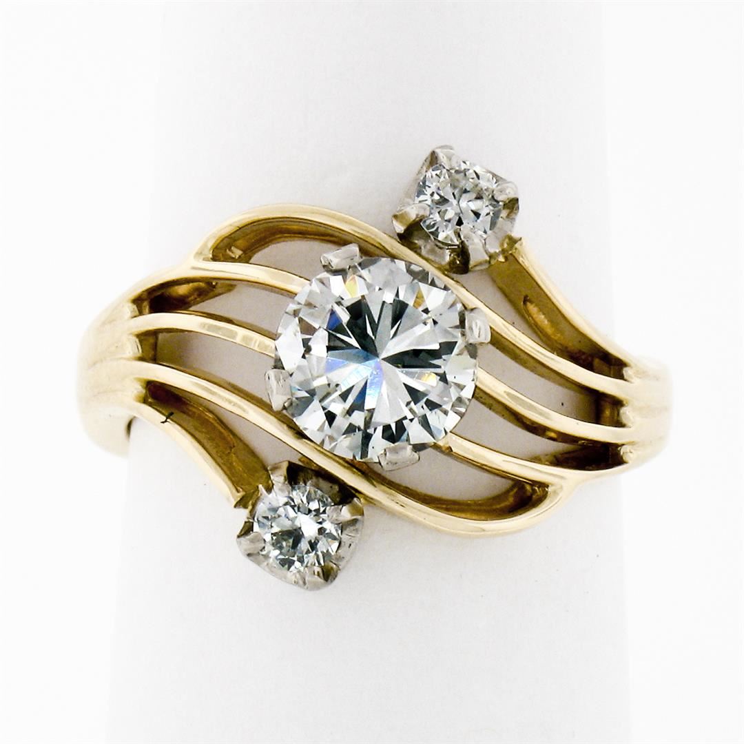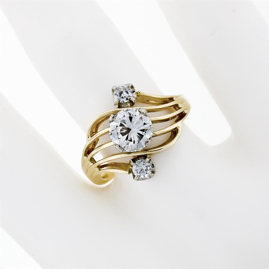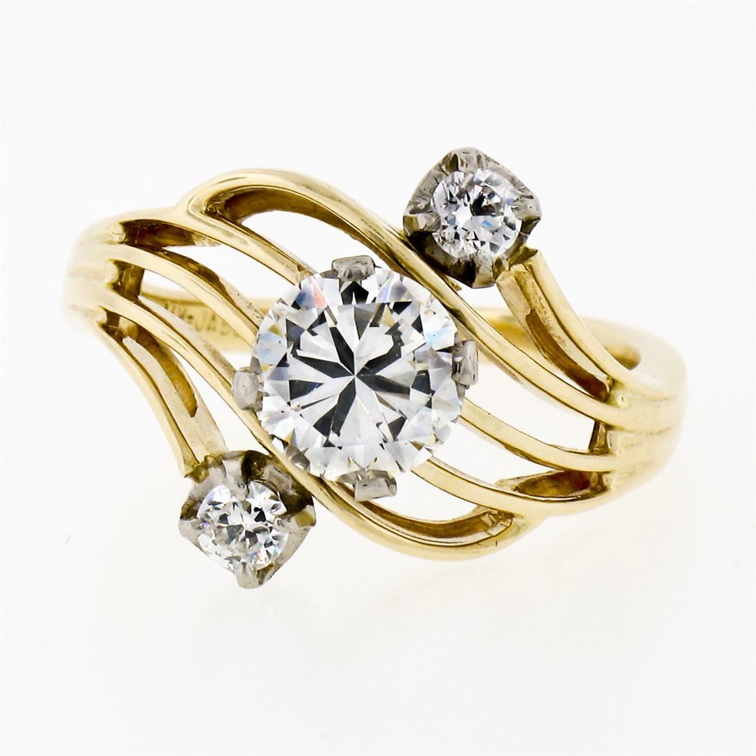 An anitqiue solid 14 yellow gold and white gold open swirl engagement ring. with 1 Gia certified round brilliant cut natural diamonds (G - SI1 ; 1.03ct), and 2 old european cut natural diamonds (G/H - VS1/VS2 ; 0.16ctw). The ring is size 5.5, weighs a total of 4.27 grams, and measures 14.7mm wide. Comes with all original relevant certifications.