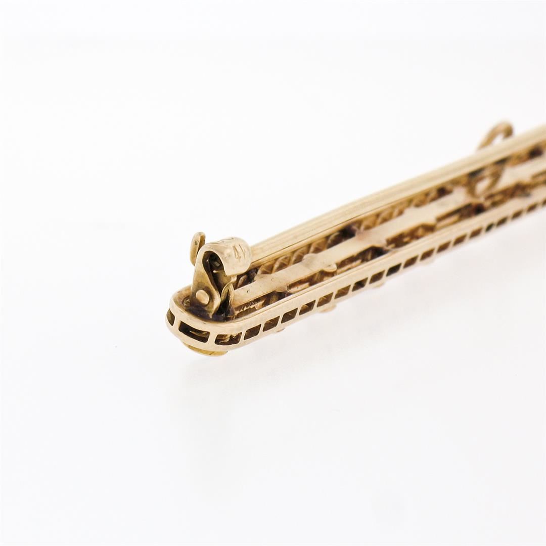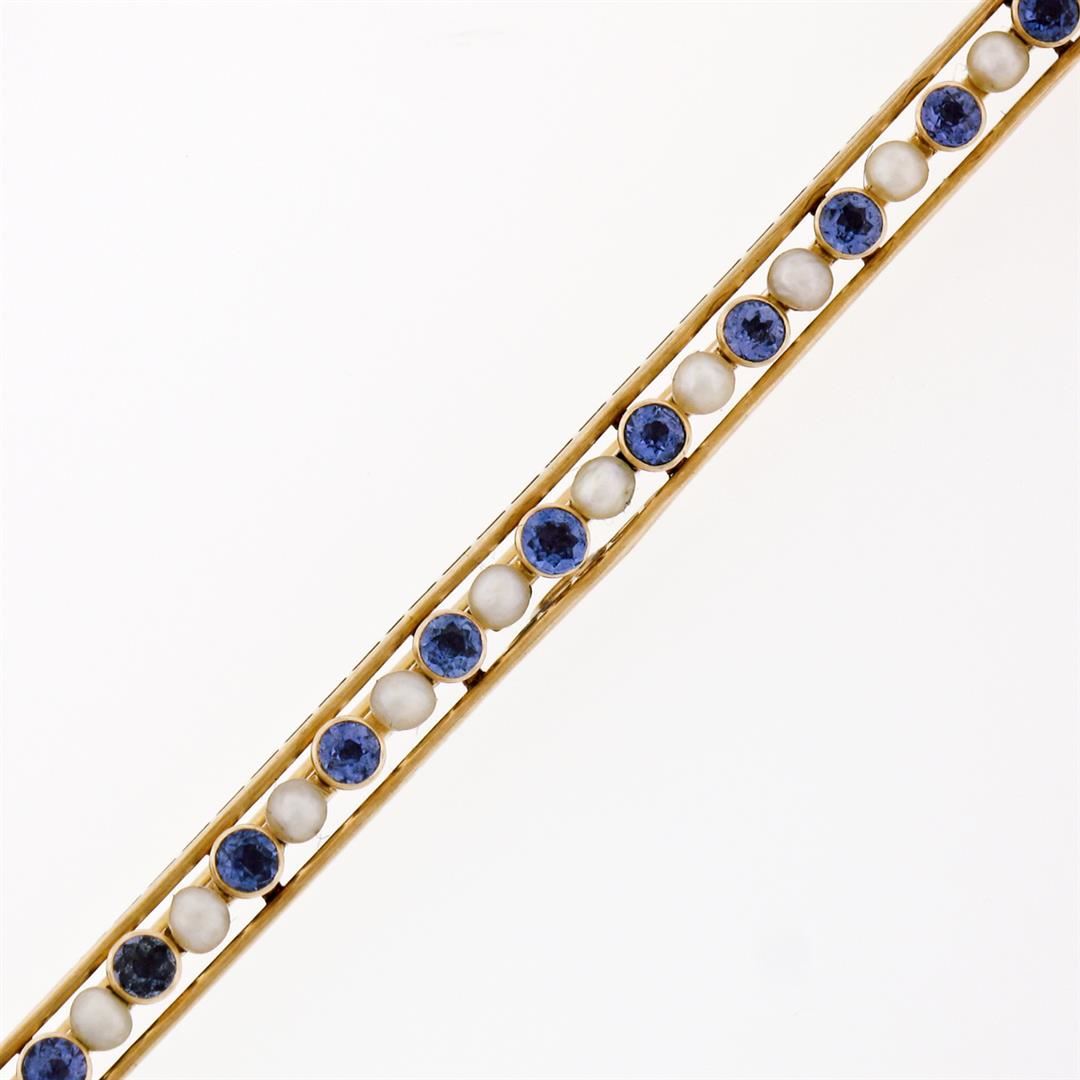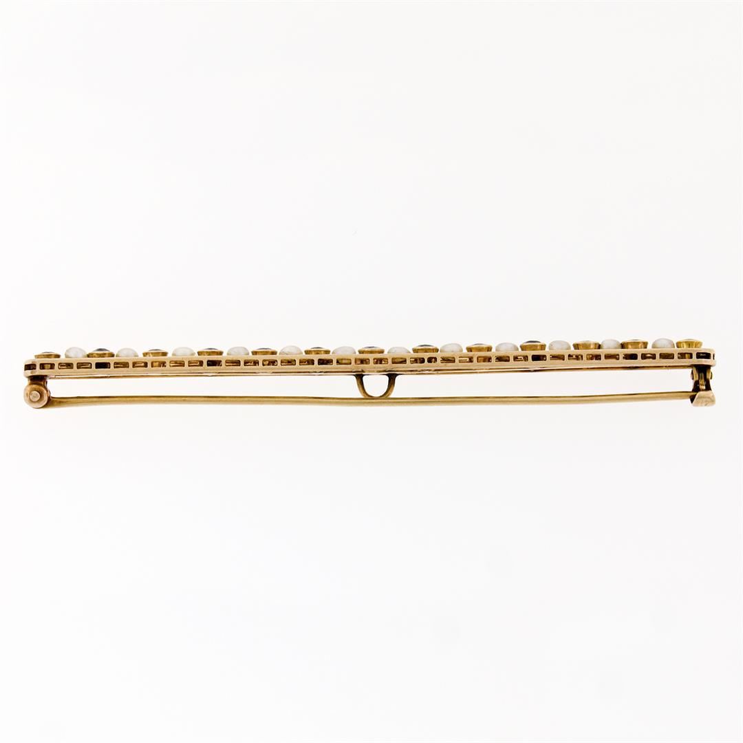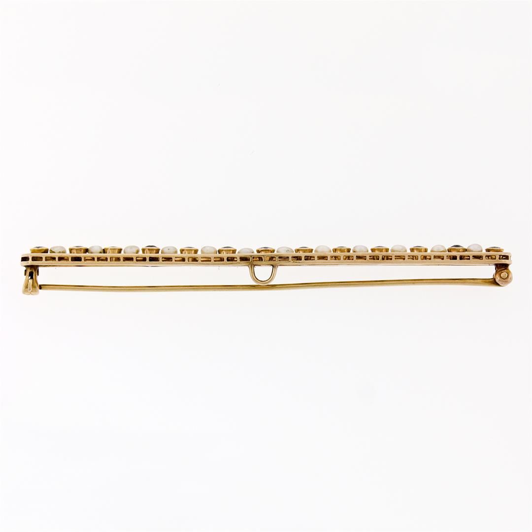 Antique Krementz 14k Gold 1.30ctw Old Sapphire Natural Pearl Long Bar Pin Brooch. Please see photos and description for all available information. An antique krementz solid 14k yellow gold bar pin brooch. featuring 13 old round cut natural sapphires (1.30ctw), alternated with 12 round cut natural pearls (2.6-2.8). Measures 4.9x79mm and weighs a total of 6.19 grams.