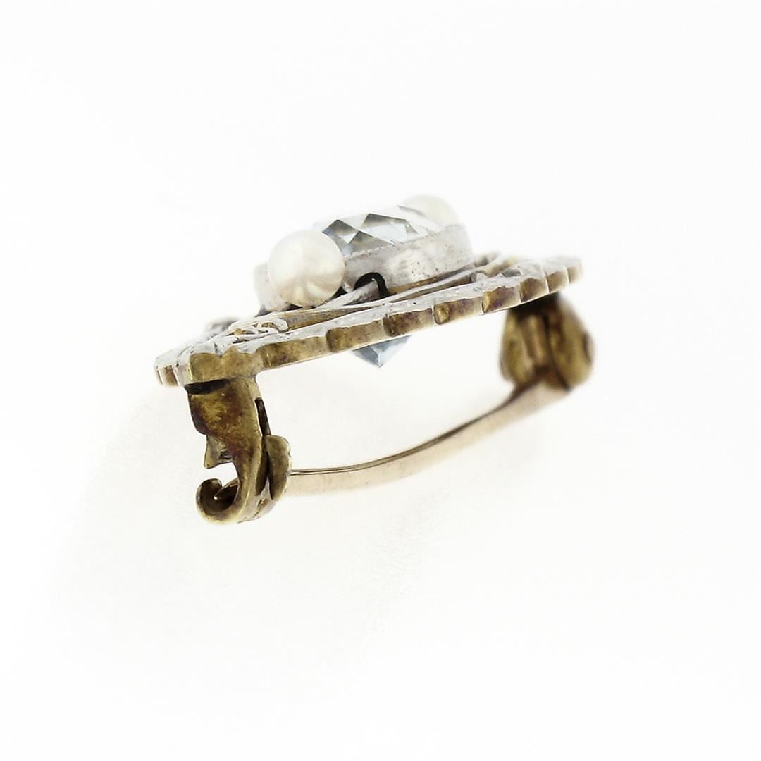 An antique art nouveau solid 14k yellow gold & platinum pin brooch by Krementz, with 1 oval cut natural aquamrine (8.2x6.1mm - 1.25ct), 2 round shape natural pearls (2.3mm). Measures 11.45x38.1mm and weighs a total of 3.03 grams.