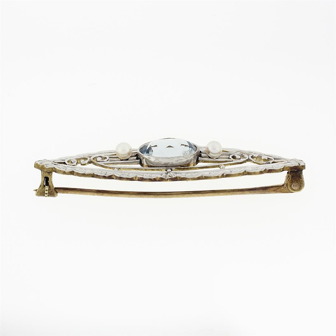An antique art nouveau solid 14k yellow gold & platinum pin brooch by Krementz, with 1 oval cut natural aquamrine (8.2x6.1mm - 1.25ct), 2 round shape natural pearls (2.3mm). Measures 11.45x38.1mm and weighs a total of 3.03 grams.