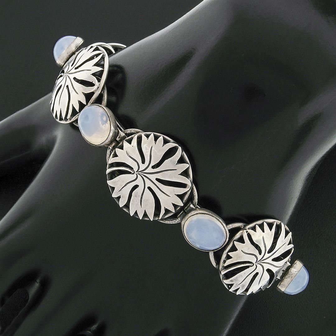 An antique solid silver foliage bracelet by Lauritz JensenIt, featuring 6 oval cabochon cut moonstones (7.50x9.25mm). weighs a total of 26.85 grams, measures 19.44mm wide, and measures 7.25 inches in length.