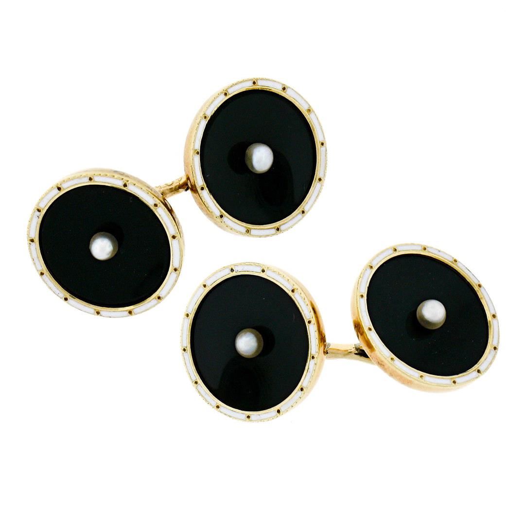 A antique solid 14k yellow gold cufflinks, with 4 black onyx and 4 round shape natural pearls (2.3mm). These cuff links have a chain cufflinks design with a clearance of 13.8mm, weigh a total of 4.9 grams, and the front panels measure 12.5mm in diameter.