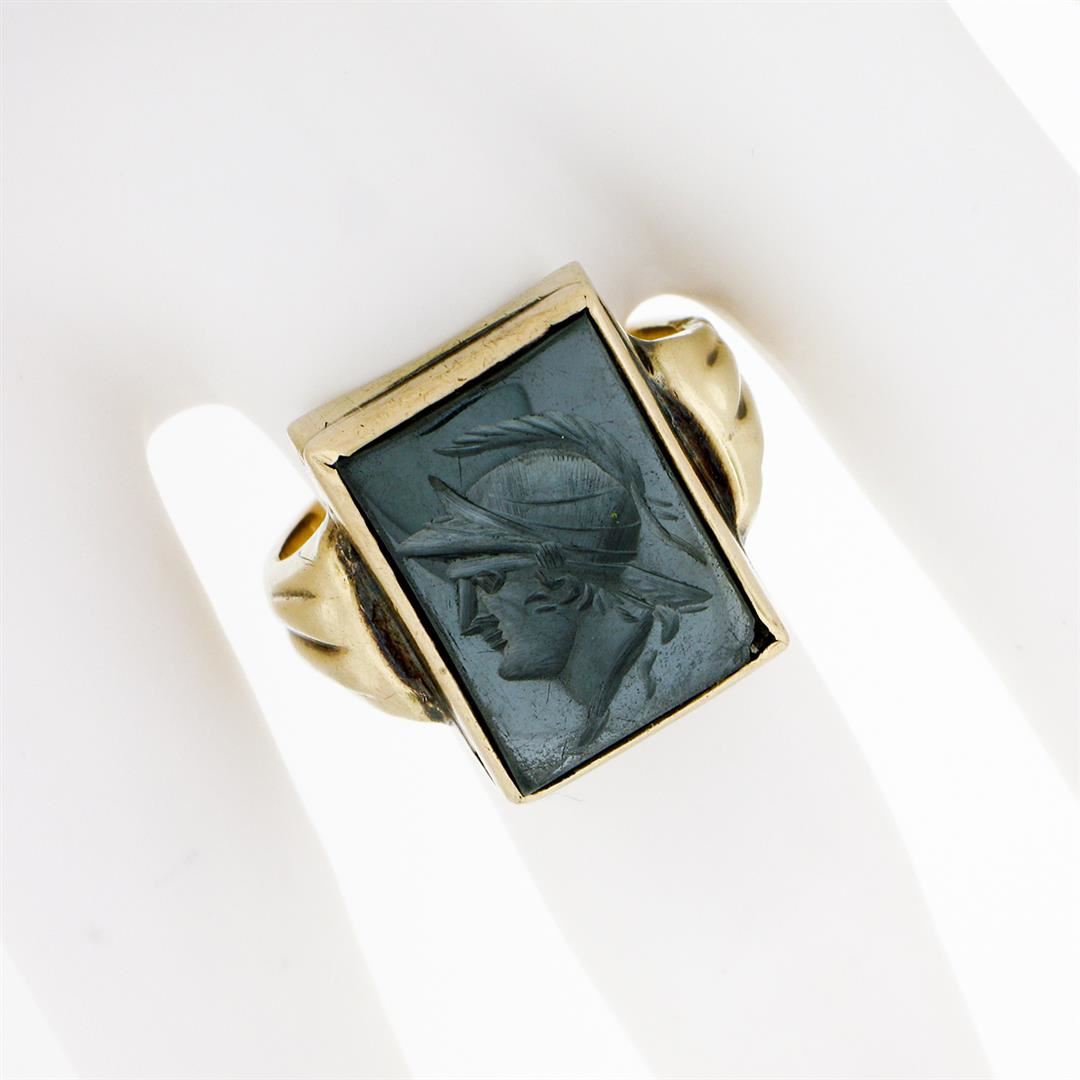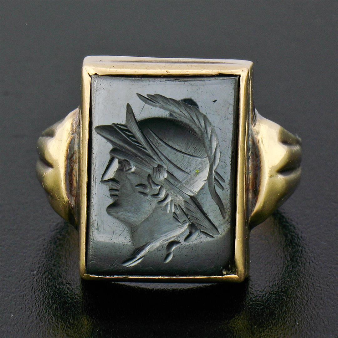 An antique solid 10k yellow gold intaglion solitaire ring, with 1 rectangular cut carved natural hematite (15.30x11.30mm). The ring is size 8.5, weighs a total of 7.47 grams, and measures 17.50mm wide.