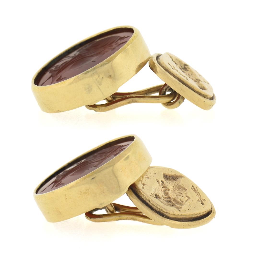 An antique solid 14k yellow gold cufflinks, with 2 round carved intaglio carnelians (17.1mm each). These cuff links have a chain link design with a clearance of 18.3mm, weigh a total of 16.90 grams, and the front panels measure 18.8x18.8mm.