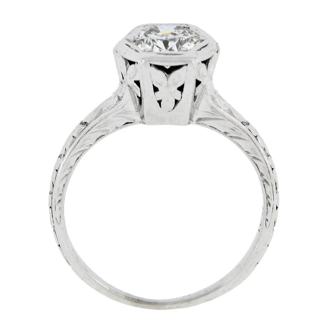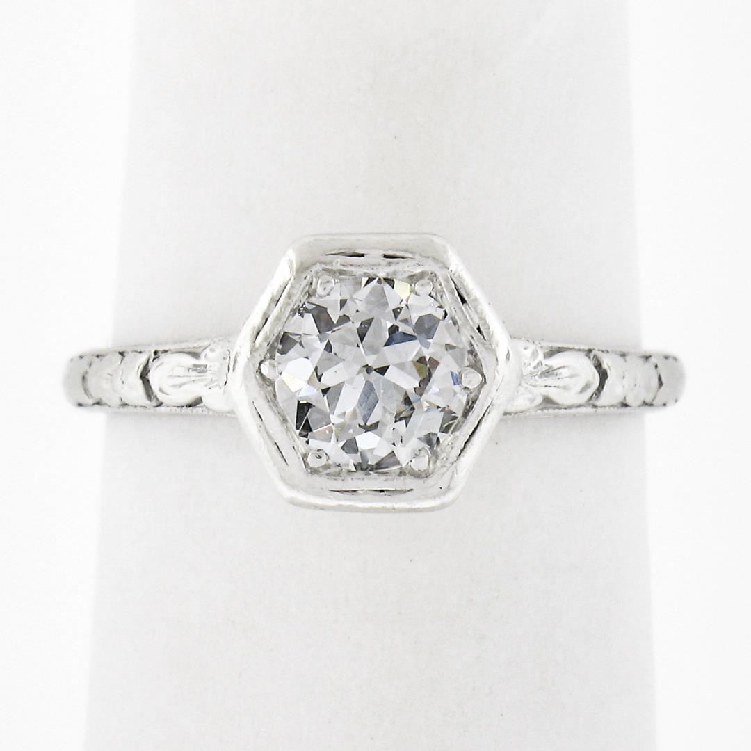 An antique solid platinum engagement ring by Orange Blossom, with 1 old european cut natural diamond (G - VS1 ; 0.60ctw). The ring is size 4.5, weighs a total of 3.33 grams, and measures 7.8mm wide.