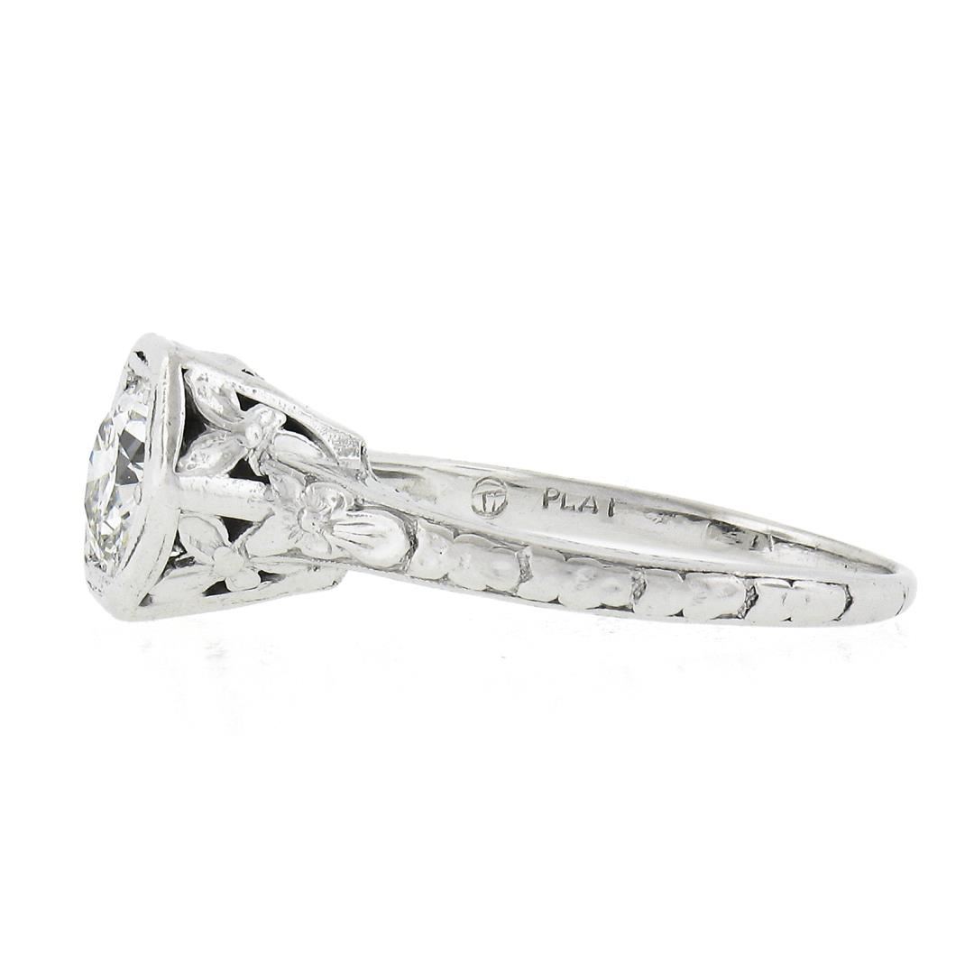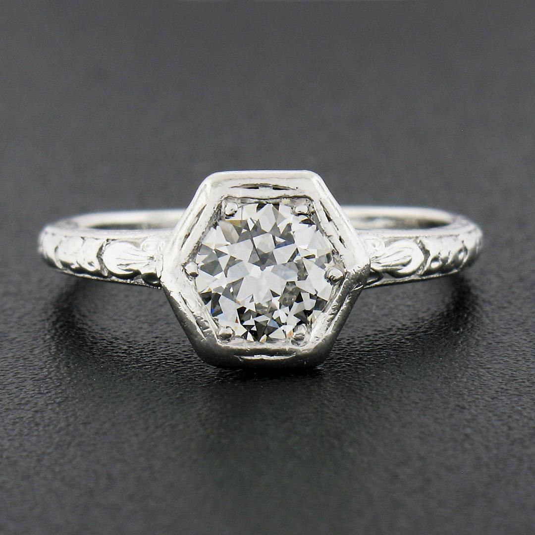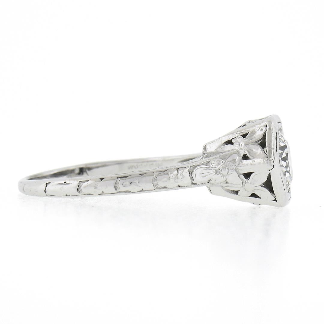 An antique solid platinum engagement ring by Orange Blossom, with 1 old european cut natural diamond (G - VS1 ; 0.60ctw). The ring is size 4.5, weighs a total of 3.33 grams, and measures 7.8mm wide.