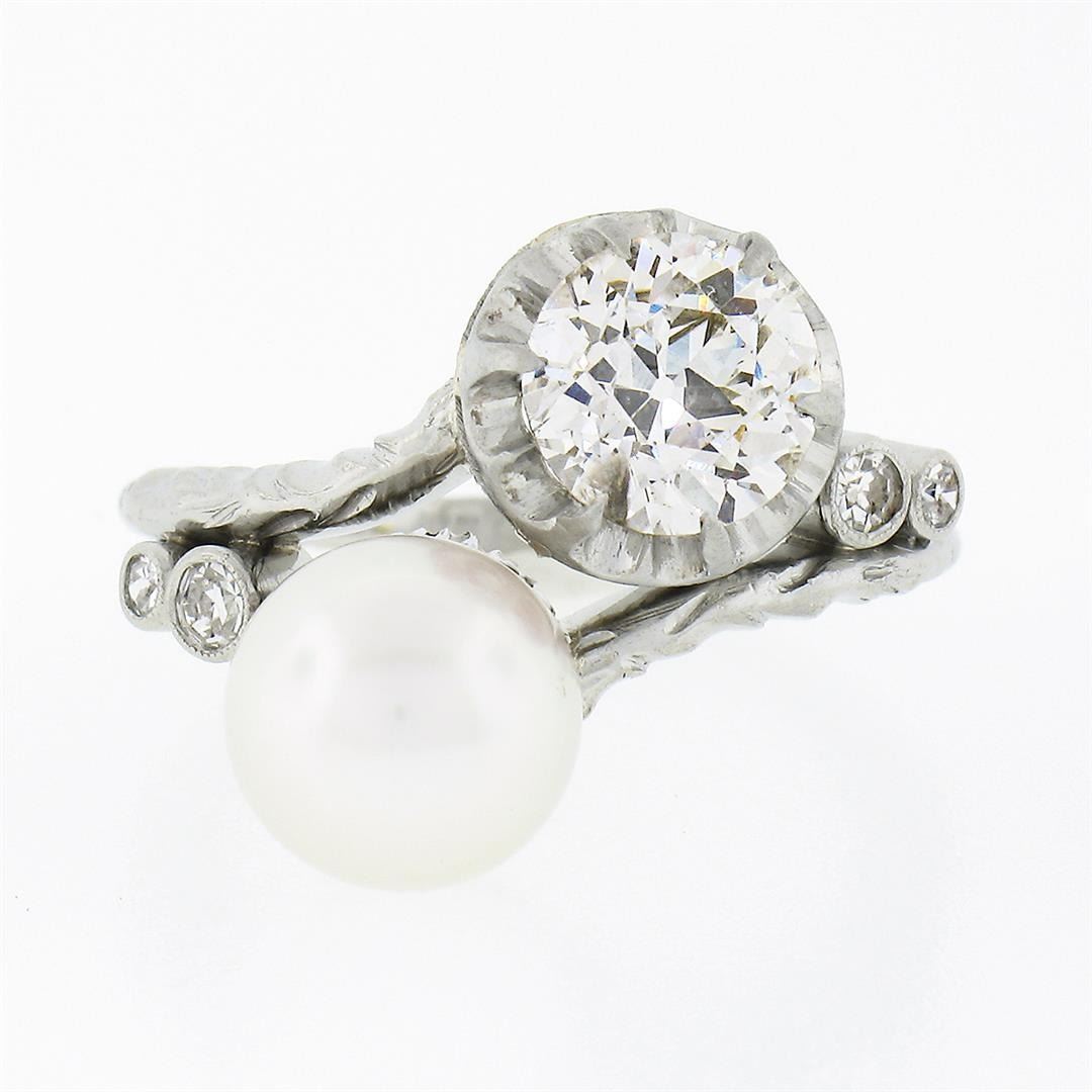 An antique solid platinum bypass ring, with 1 Gia certified old European cut natural diamond (J - I1 ; 1.36c), and 1 round shape cultured pearl (8.20mm), accented with 4 old single cut natural diamonds (G/H - VS1/VS2 ; 0.14ctw). The ring is size 5.0, weighs a total of 6.80 grams, and measures 15.30mm wide. Comes with all original relevant certifications.