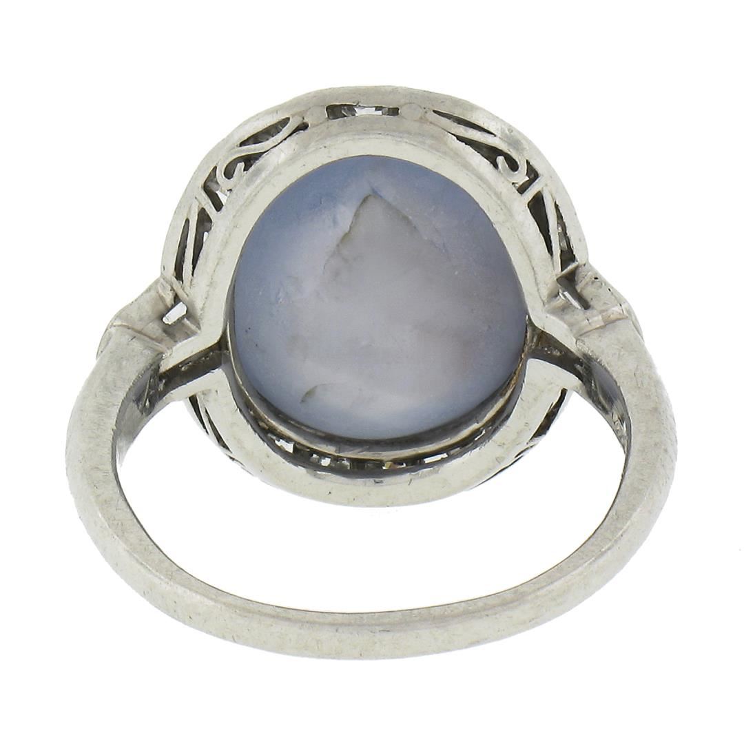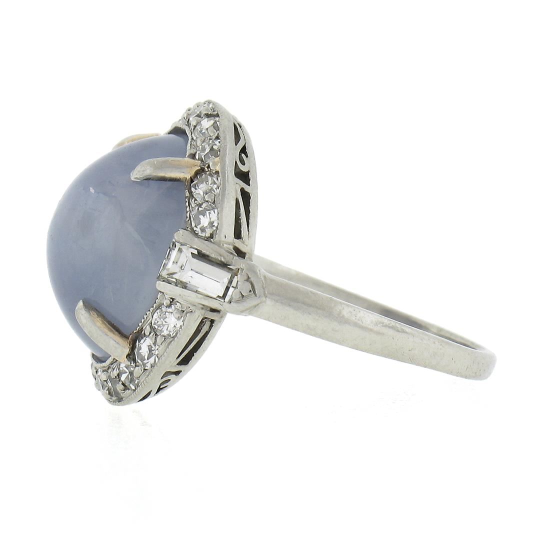 An antique solid paltinum ring, with 1 GIA graded oval cabochon cut natural star sapphire (11.38ct), and 2 baguette cut natural diamonds (F/G - VS1/VS2 ; 0.24ctw ), and 18 odl single cut natural diamonds (F/G - VS1/VS2 ; 0.25ctw). The ring is size 4.5, weighs a total of 5.63 grams, and measures 15.6mm wide. Comes with all original relevant certifications.