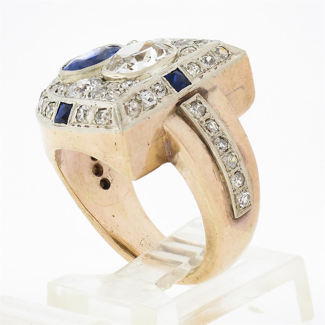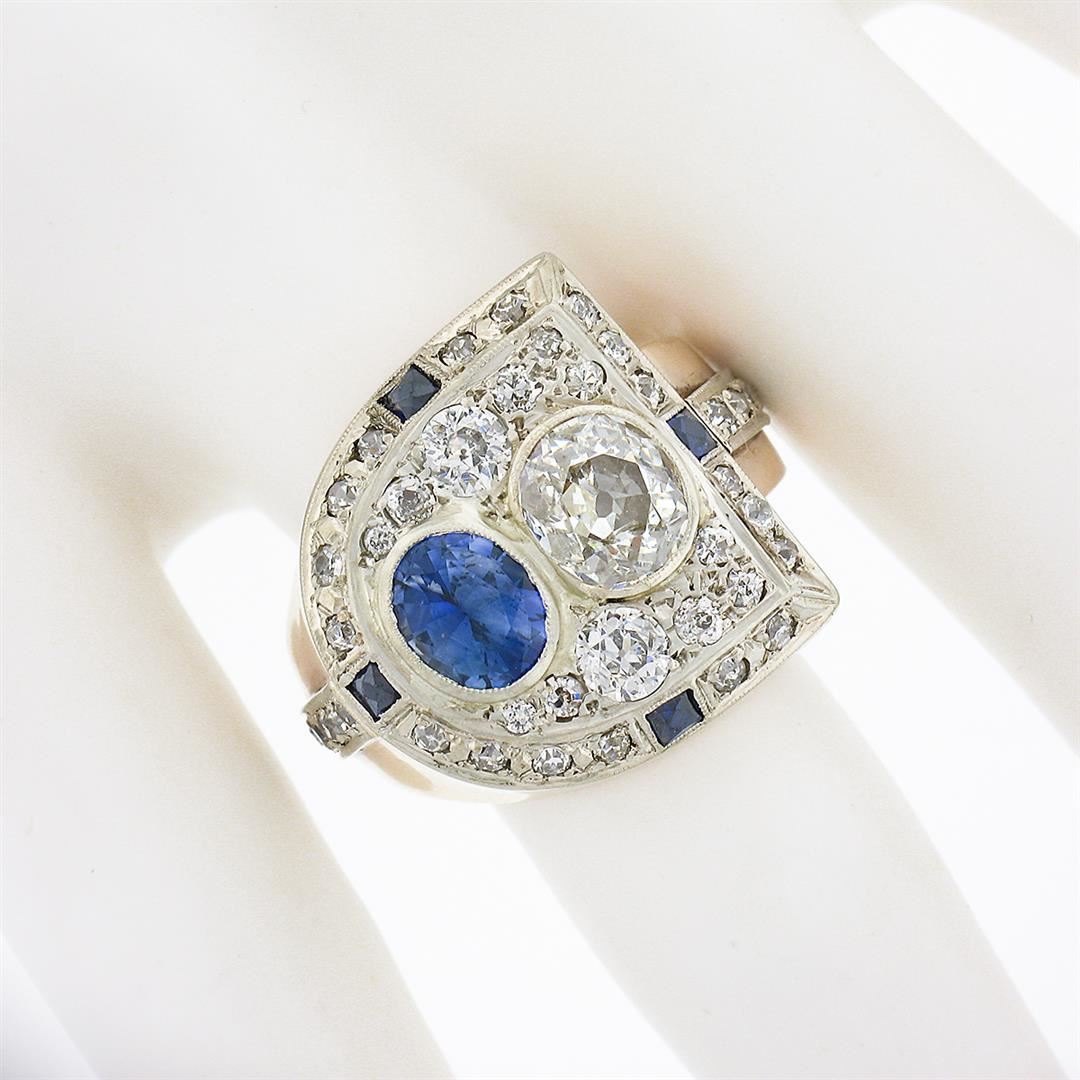 An antique solid 14k rose and white gold ring, with 1 gia certified cushion cut natural diamond (1.09ct ), and 1 oval cut natural sapphire (1.04ct), with 4 square French cut natural sapphires (0.32ctw)), and 42 old cut natural diamonds (H/I - VS1-SI1 ; 1.20ctw). The ring is size 6.5, weighs a total of 11.94 grams, and measures 19.25mm wide. Comes with all original relevant certifications.