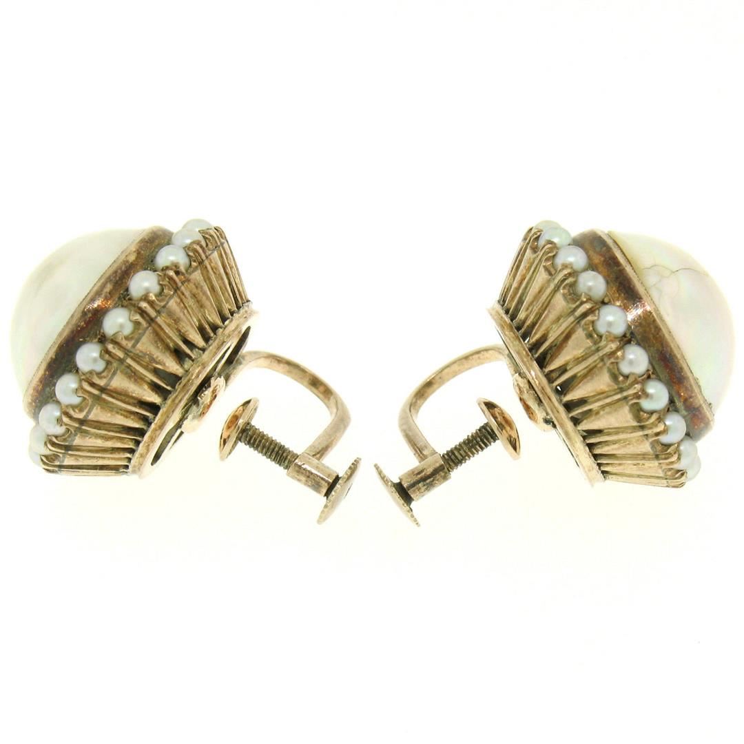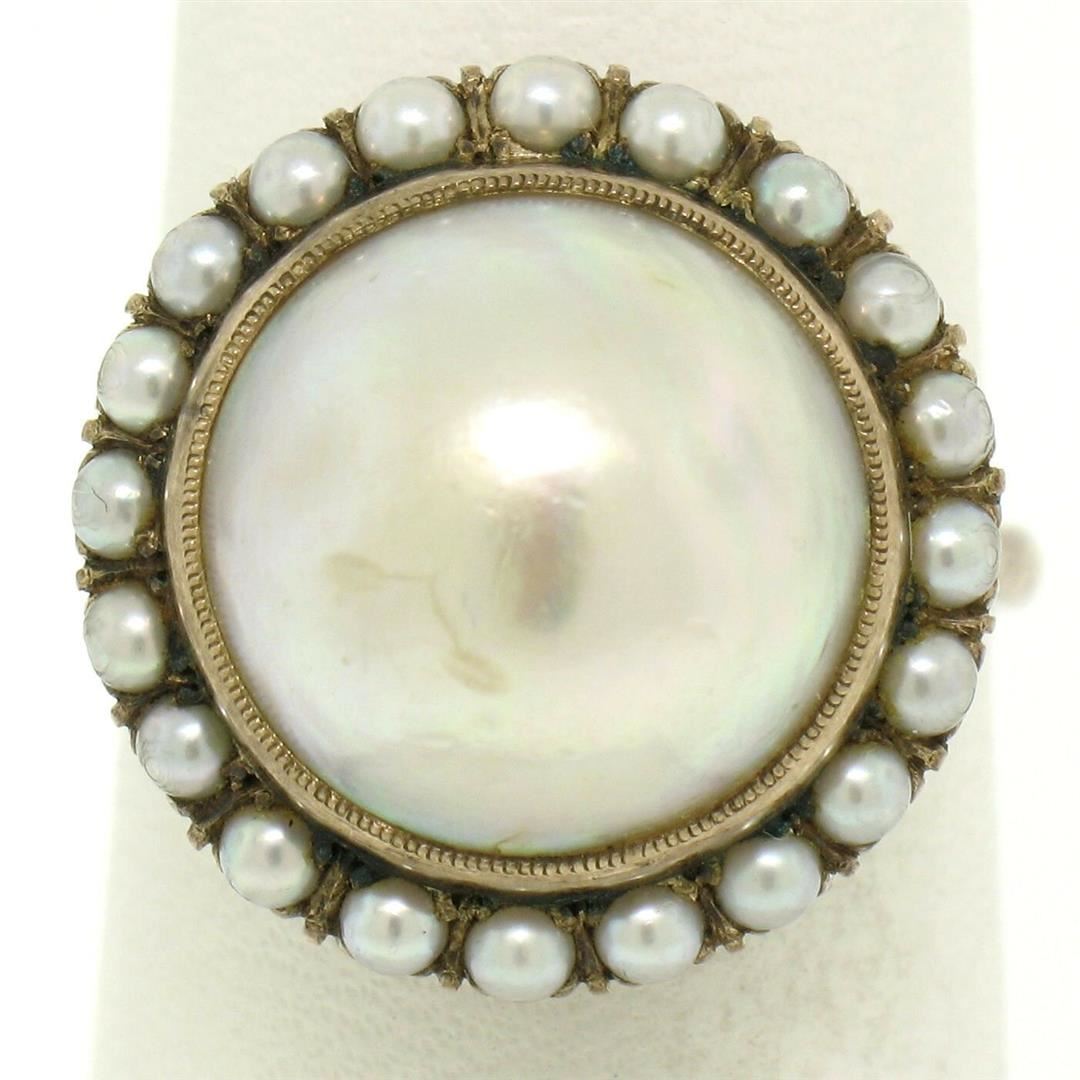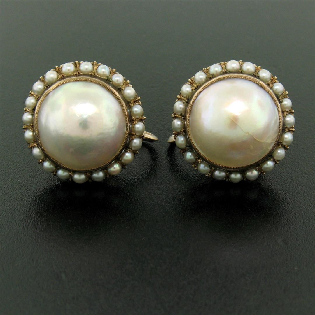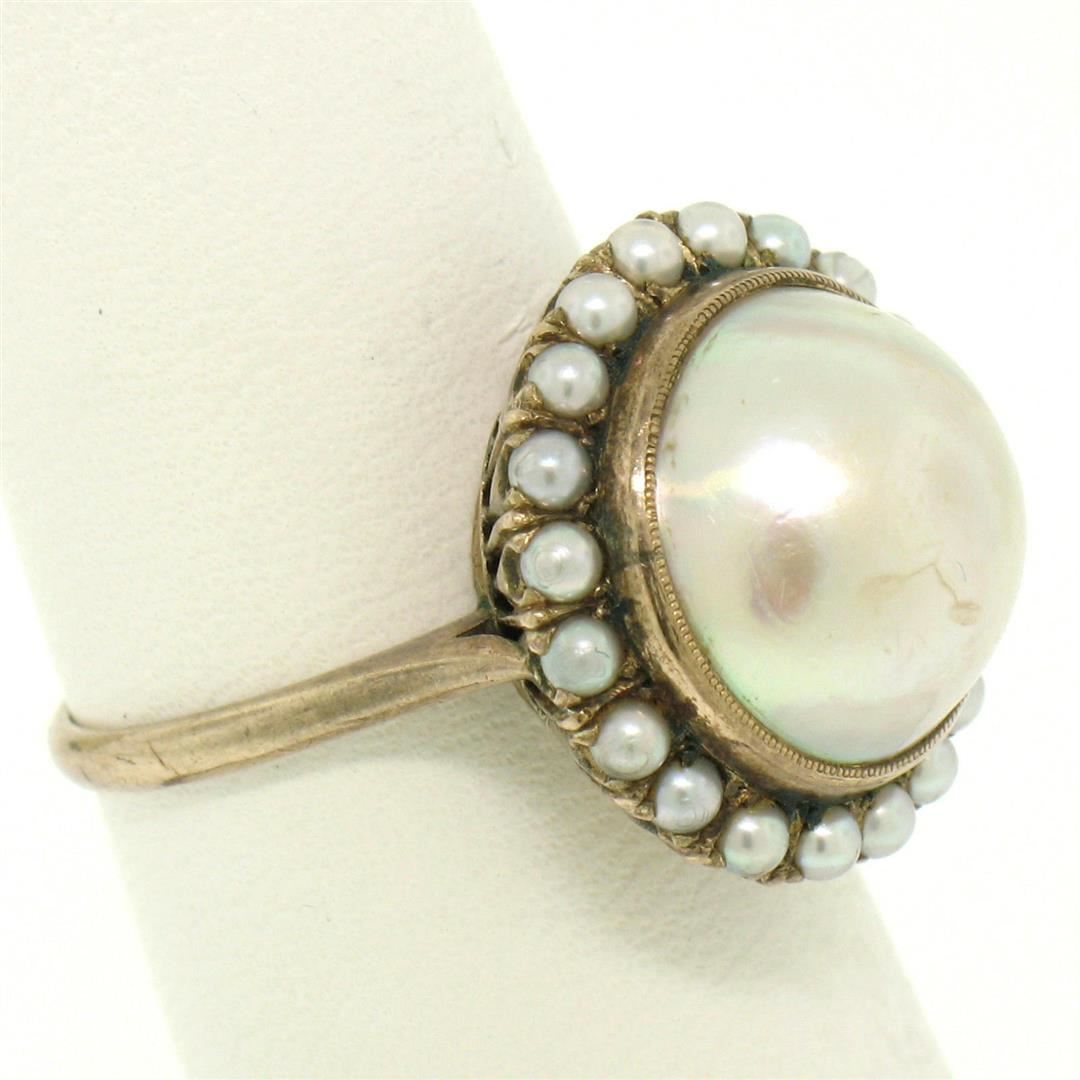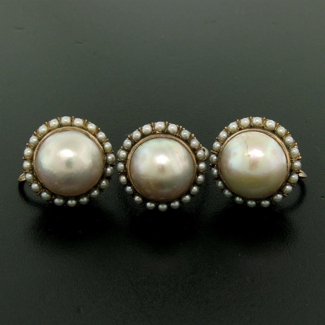 One Antique Victorian 10K Rose Gold Bezel Mabé Prong Seed Pearl Ring & Earrings Set. Item Details: Material: 10k Solid Rose Gold, Weight: 18.3 Grams, Stone(s): (3) Natural Genuine Mabé Pearls - Round Cabochon Shape - Bezel Set - Pinkish Off-White Color - 13.0mm (approx.), (60) Natural Genuine Seed Pearls - Prong Set - Ivory Color - 2.0mm (approx.), Ring Size: 6.25 , Ring Width: 17.40mm, Ring Height: 11.56mm rise off the finger, Earrings Backing: Screw Back w/o Posts (no pierced earring needed) Earrings Width: 17.40mm Earrings Height: Condition: Antique - Excellent Condition! 11.56mm