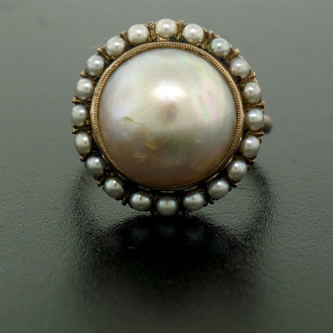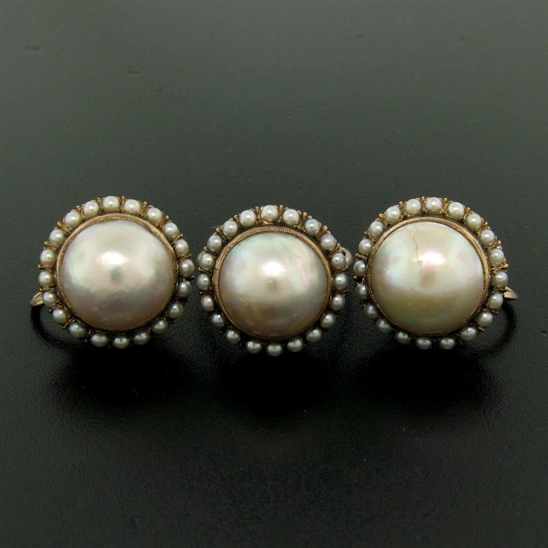 An antique victorian solid 10k rose gold set of earrings and ring, featuring 3 round natural mabe pearls (13.0mm ) with a halo of 60 natural seed pearls (2.0mm). The earrings measure approximately 11.56x17.40mm and weigh a total of 18.3 grams. The ring is size 6.25, measures 17.40mm wide.