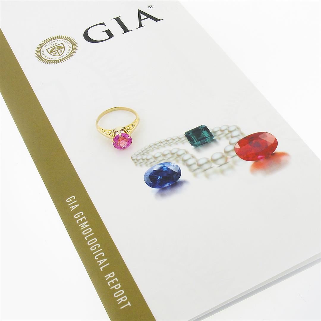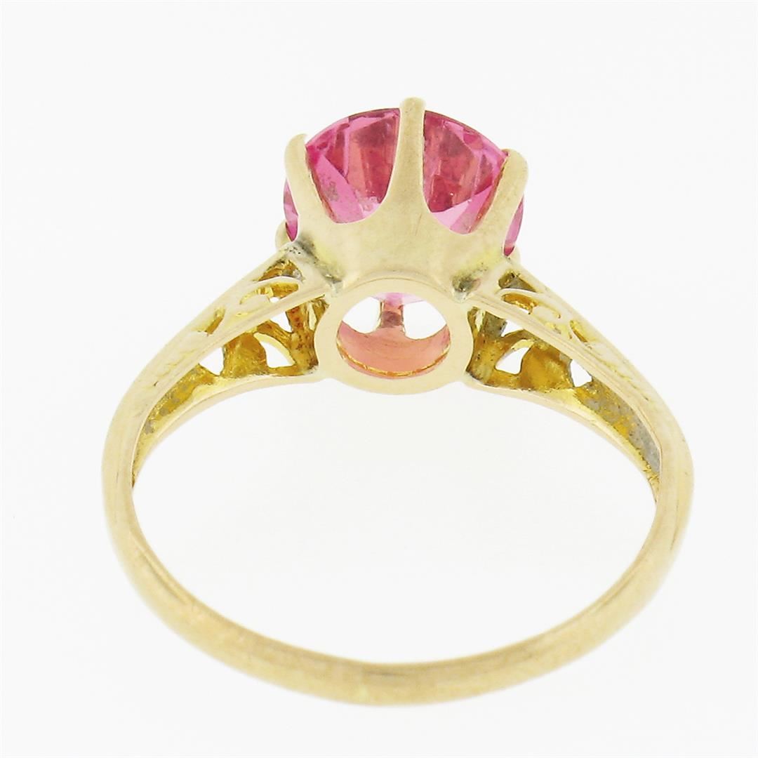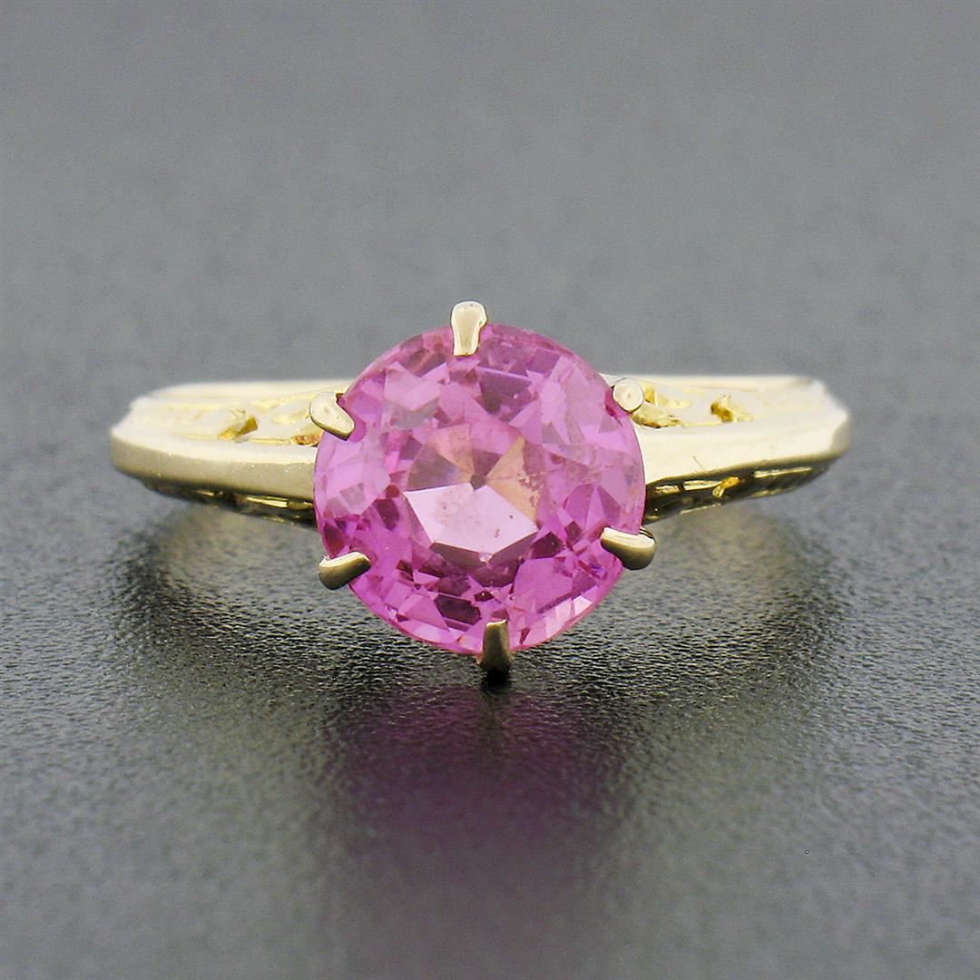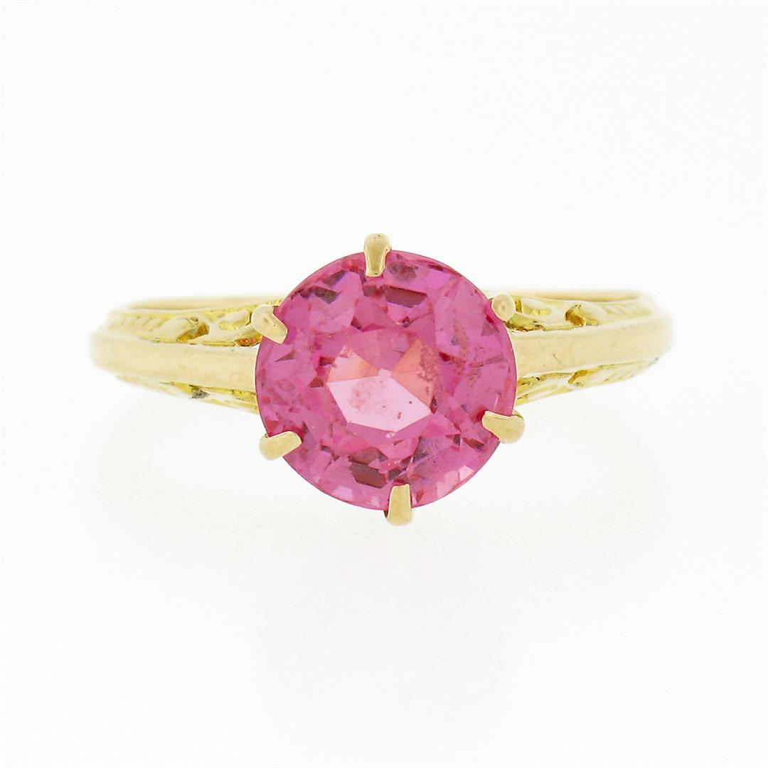 An antique solid 10k yellow gold solitaire ring, with 1 Gia certified old round cut lab grown pink sapphire. The ring is size 4.0, weighs a total of 1.72 grams, and measures 8.25mm wide. Comes with all original relevant certifications.
