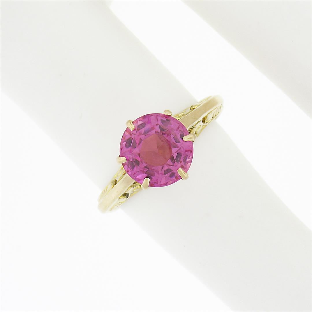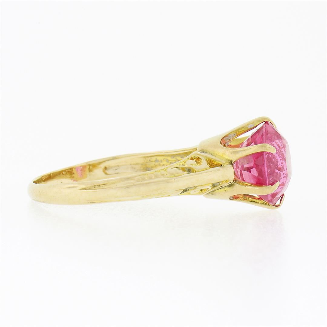 An antique solid 10k yellow gold solitaire ring, with 1 Gia certified old round cut lab grown pink sapphire. The ring is size 4.0, weighs a total of 1.72 grams, and measures 8.25mm wide. Comes with all original relevant certifications.