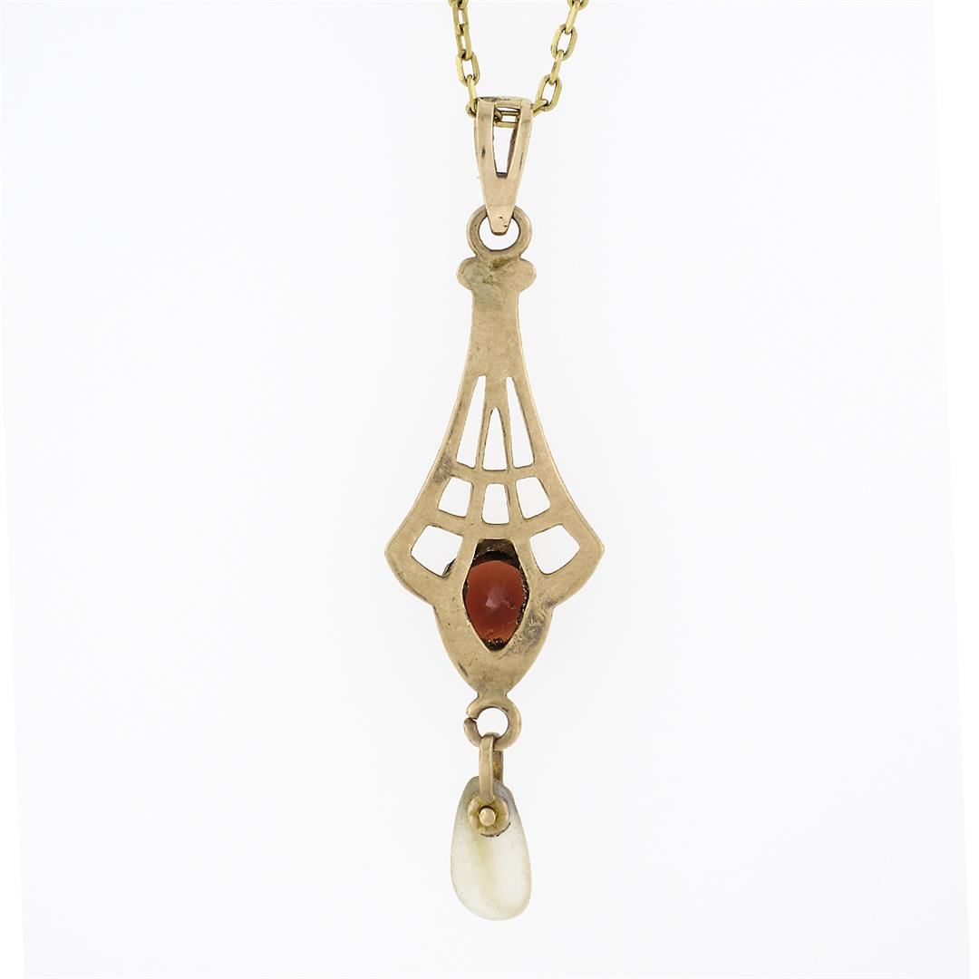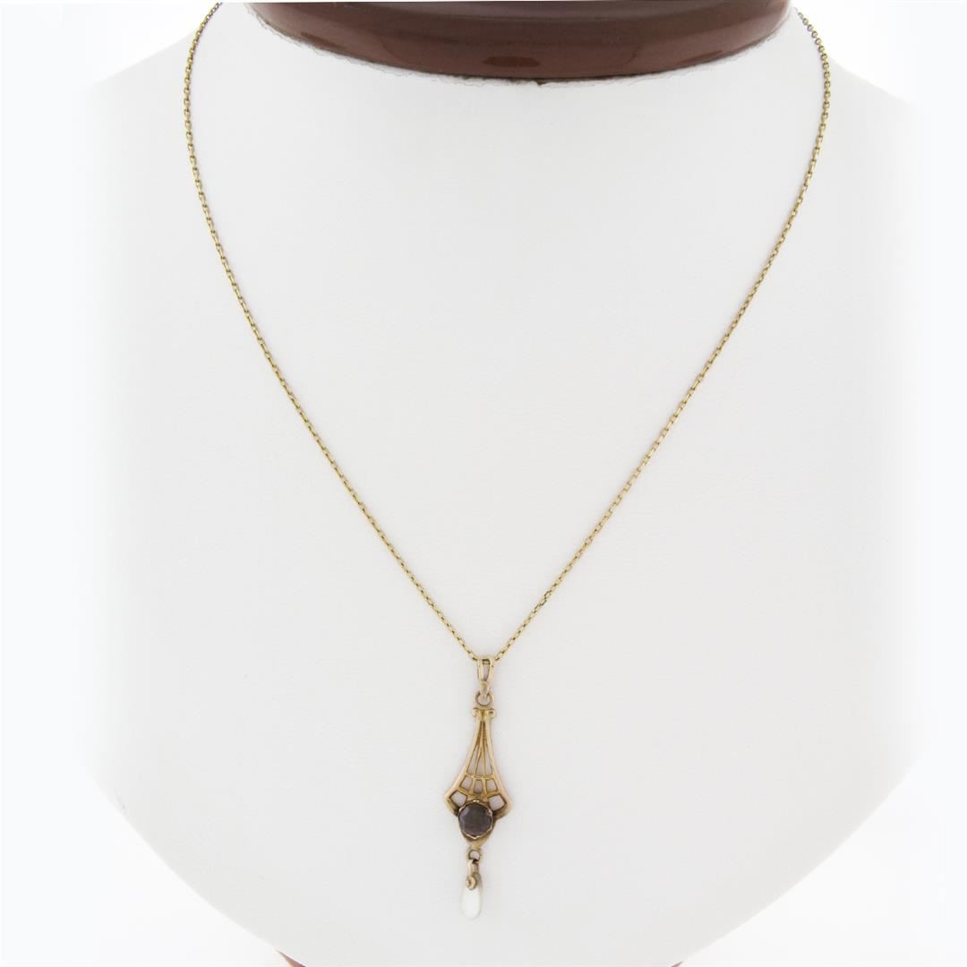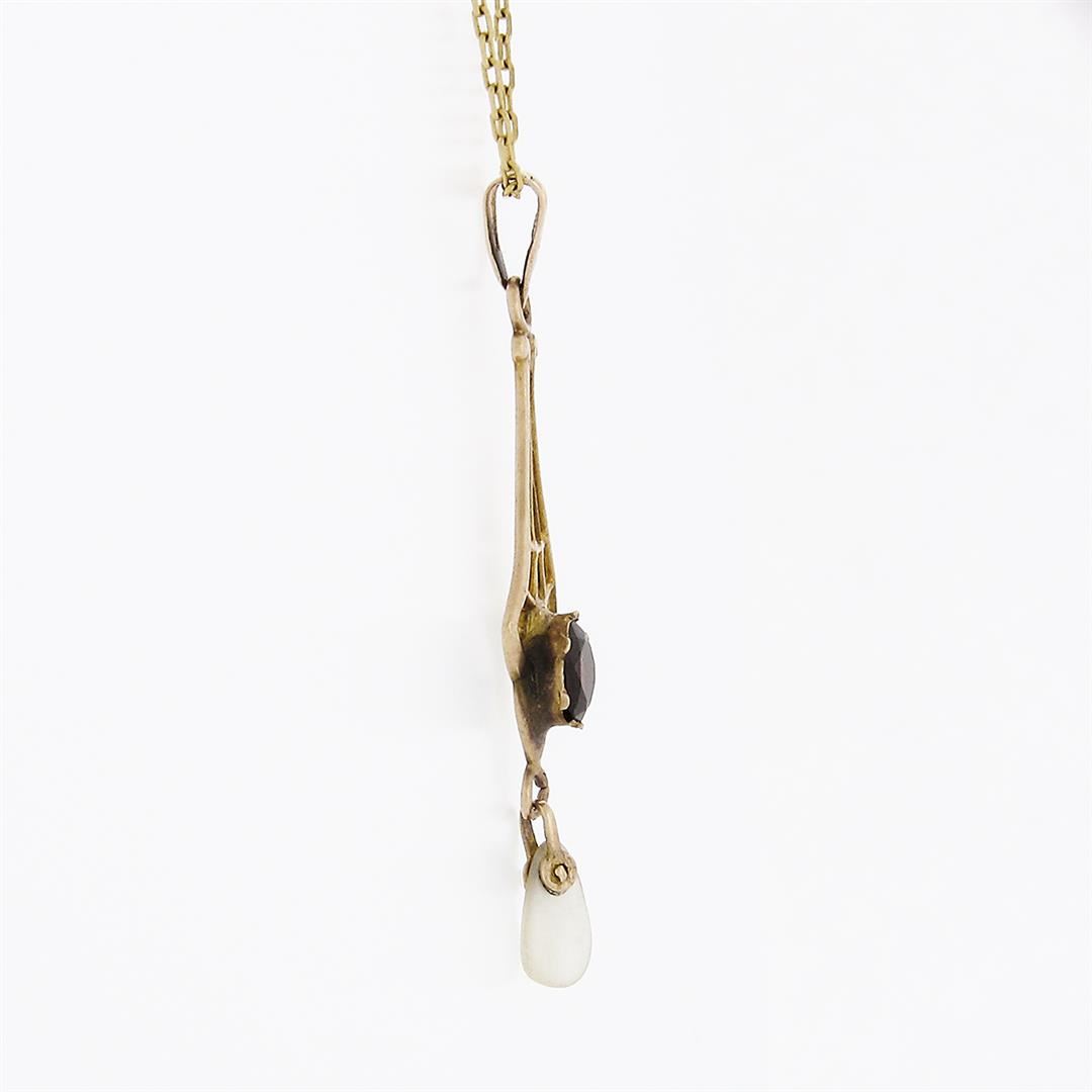 A victorian solid 10k yellow gold pendant with new 14k yellow gold chain necklace, featuring 1 round brilliant cut natural garnet (0.50ct), and 1 unique shape cultured mother of pearl (6.6x3.9mm). 16 inch cable link chain, 2.2 grams total weight, pendant measures 36.35x9.6mm.